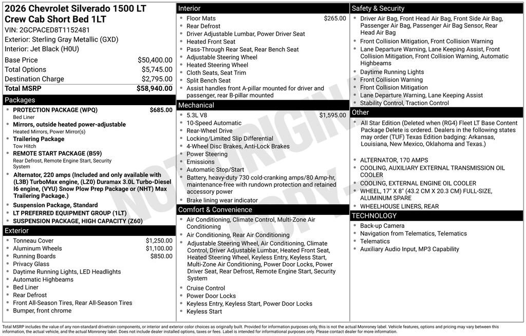 SUSPENSION PACKAGE, HIGH CAPACITY, REMOTE START PACKAGE includes (BTV) Remote Start, (UTJ) Theft-deterrent system and (C49) rear-window defogger, PROTECTION PACKAGE includes (B1J) wheel house liners and (CGN) Chevytec spray-on bedliner , TRANSMISSION, 10-SPEED AUTOMATIC, ELECTRONICALLY CONTROLLED with overdrive and tow/haul mode. Includes Cruise Grade Braking and Powertrain Grade Braking, TIRES, 275/60R20 ALL-SEASON, BLACKWALL, TIRE, SPARE 255/80R17SL ALL-SEASON, BLACKWALL, THEFT-DETERRENT SYSTEM, UNAUTHORIZED ENTRY, STERLING GRAY METALLIC, SEATS, FRONT 40/20/40 SPLIT-BENCH with covered armrest storage and under-seat storage (lockable) (STD), REMOTE VEHICLE STARTER SYSTEM.