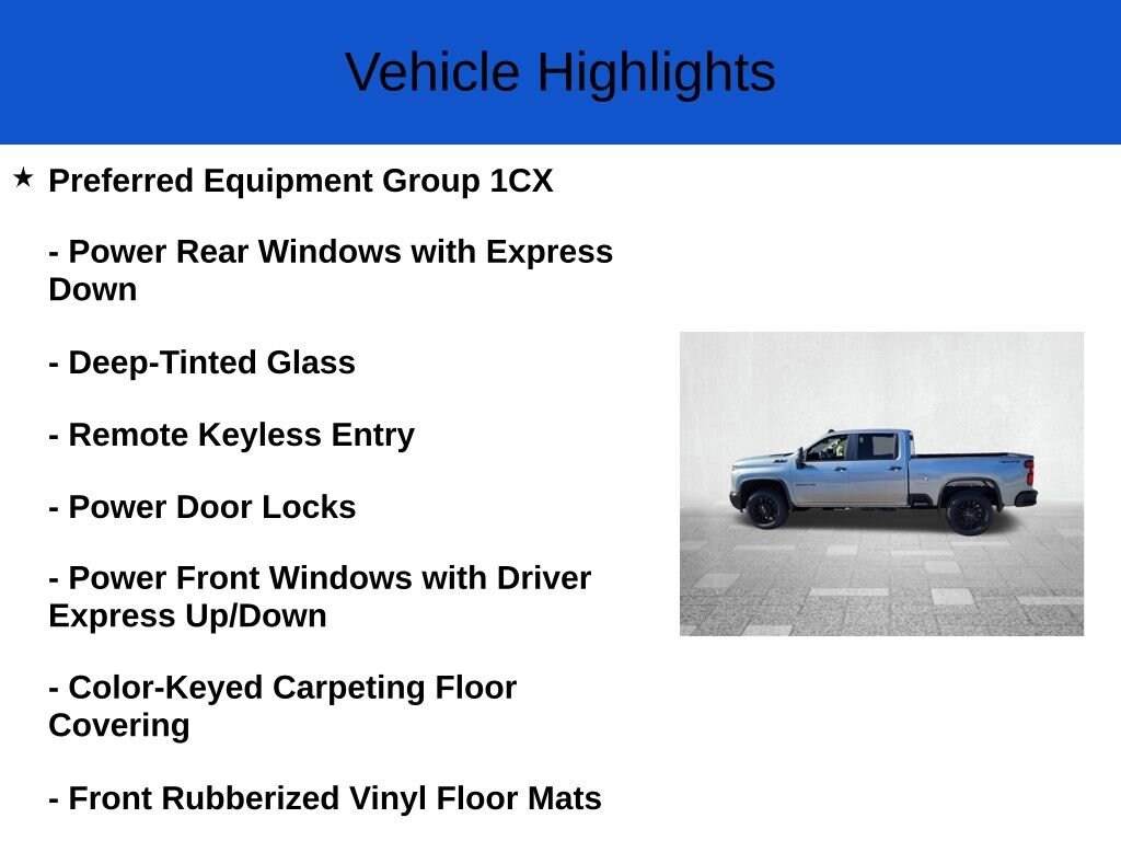 SNOW PLOW PREP/CAMPER PACKAGE includes (KW5) 220-amp alternator, includes increased front GAWR on Heavy Duty models, (NZZ) skid plates (transfer case and oil pan), pass through dash grommet hole and roof emergency light provisions., CUSTOM VALUE PACKAGE includes (PCX) Custom Convenience Package, (PQA) WT/CX Safety Package, (DWI) outside power-adjustable vertical trailering mirrors with heated and auto-dimming upper glass, lower convex spotter mirrors, turn signal indicators, puddle lamps, perimeter lighting and (DD8) auto-dimming rearview mirror, CUSTOM CONVENIENCE PACKAGE includes (BTV) Remote Start with (UTJ) content theft alarm, (KI4) 120-volt power outlet, (KC9) 120-volt bed-mounted power outlet, (UBI) 2 charge-only USB ports for second row, (C49) rear-window defogger, (A2X) 10-way power driver seat including power lumbar, (UF2) bed LED cargo area lighting, (QT5) EZ Lift power lock and release tailgate (Included with (PDX) Custom Value Package. Beginning with the start of production certain vehicles will be forced to include (RFO) Not Equipped with USB ports rear.), CUSTOM BLACKOUT PACKAGE includes Black badging, (SRI) 20" High gloss Black painted wheels, Black steering wheel emblem, (SB7) Black tailgate CHEVROLET lettering decal, LPO with (QK1) tailgate or Black bowtie with available (QK2) Multi-flex tailgate , TRANSMISSION, 10-SPEED AUTOMATIC, TRAILERING WIRING PROVISIONS for trailering, 5th wheel and gooseneck trailer, includes additional 7-way wiring harness located at the rear of the pickup bed attached to the rear frame cross member, THEFT-DETERRENT SYSTEM, UNAUTHORIZED ENTRY, TAILGATE, GATE FUNCTION MANUAL WITH EZ LIFT includes power lock and release, STERLING GRAY METALLIC, SKID PLATES protect the oil pan, front axle and transfer case.