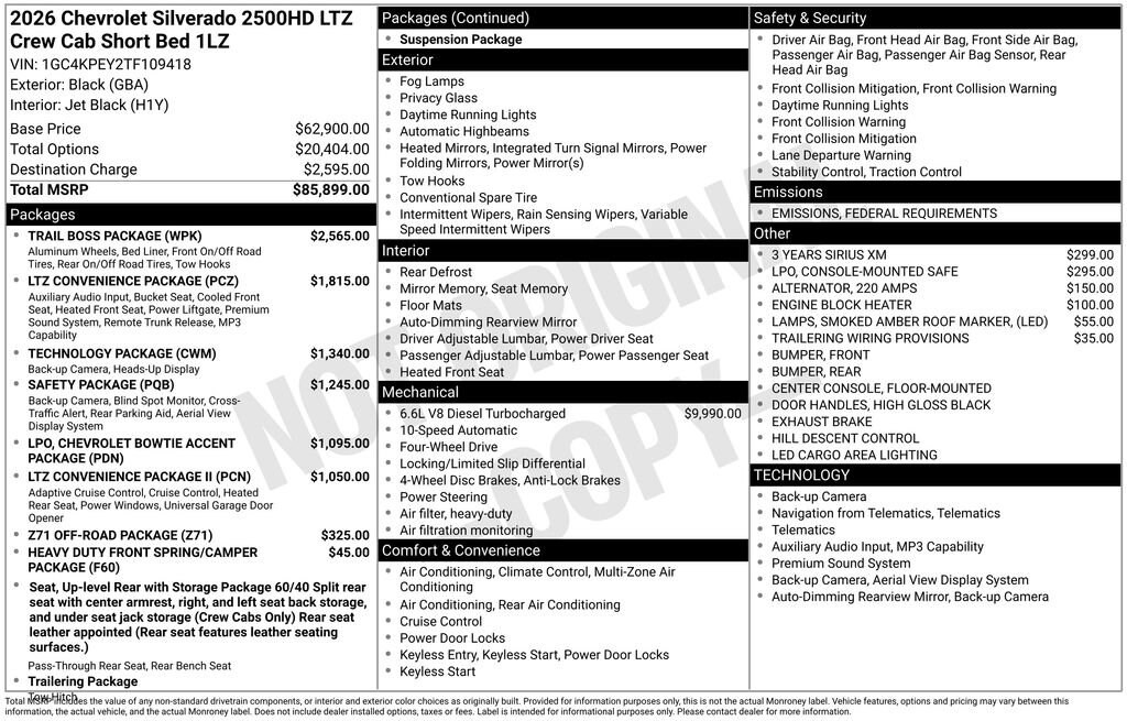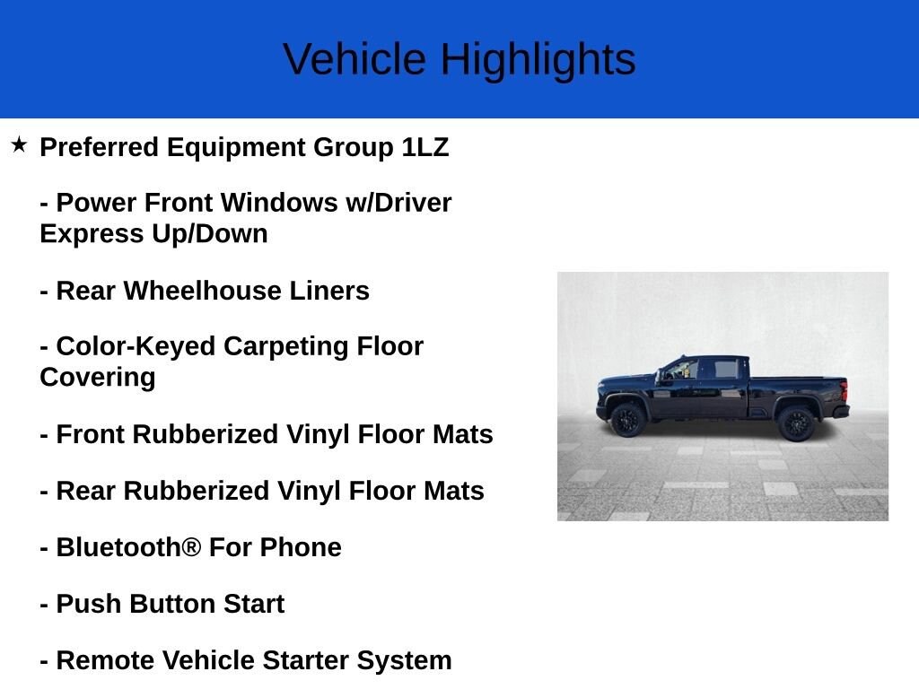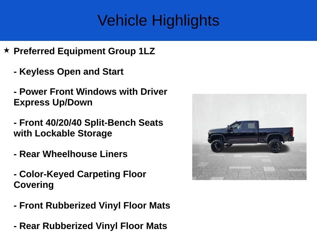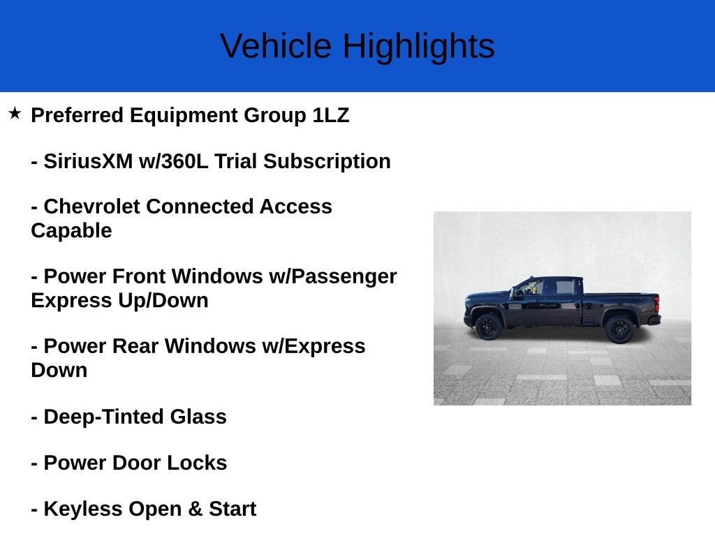 TRAIL BOSS PACKAGE Includes black grille bar with "Chevy Black Bow Tie", Black grille inserts, (SRI) 20" High gloss Black painted wheels, (VB5) High Gloss Black painted front bumper, (VT5) High Gloss Black painted rear bumper, (UGA) Red Tow Hooks, (QFG) LT275/65R20 BF Goodrich off-road tires, Black skid plate, Black badging, Black bowtie on horn pad, (DP6) High Gloss Black mirror caps, Black hood vent surround, High Gloss Black door handles and (CGN) Chevytec spray-on bedliner. Includes Black beltline moldings., TECHNOLOGY PACKAGE includes (DRZ) Rear Camera Mirror and (UV6) Multicolor 15" Diagonal Head-Up Display, SAFETY PACKAGE includes (UD5) Front and Rear Park Assist, (UKV) Trailer Side Blind Zone Alert, (UFG) Rear Cross Traffic Alert, (UV2) HD Surround Vision, (UVN) Bed View Camera and (TRG) Trailer Camera Provisions Includes (HS1) Safety Alert Seat.), LTZ CONVENIENCE PACKAGE II includes (A48) Rear sliding power window, (UG1) Universal Home Remote, (KA6) Rear Heated Outboard Seats and (KSG) Adaptive Cruise Control., LTZ CONVENIENCE PACKAGE includes (A50) bucket seats with (D07) center console, (KQV) heated and ventilated front seats, (QT6) power up/down tailgate, (UF2) bed LED cargo area lighting, (UBC) USB Ports, (UQA) Bose Premium Audio System and (K4C) Wireless Charging, LPO, CHEVROLET BOWTIE ACCENT PACKAGE includes (S3I) Puddle lamps, LPO, (SB7) Black tailgate CHEVROLET lettering, LPO, (5K4) Black bedside decal with reflective Bowtie, LPO, (dealer-installed), HEAVY DUTY FRONT SPRING/CAMPER PACKAGE , WHEELS, 20" (50.8 CM) HIGH GLOSS BLACK PAINTED WHEEL with Black center caps, USB PORTS, 2, CHARGE/DATA PORTS LOCATED INSIDE CENTER CONSOLE, UNIVERSAL HOME REMOTE.