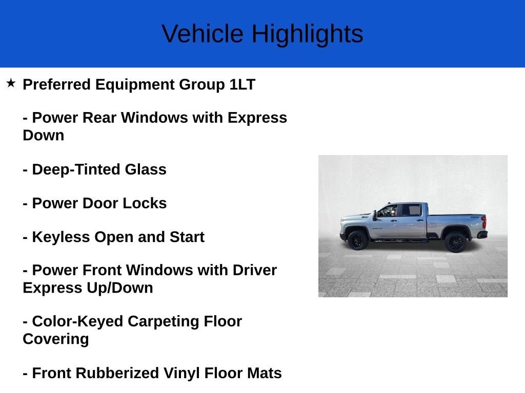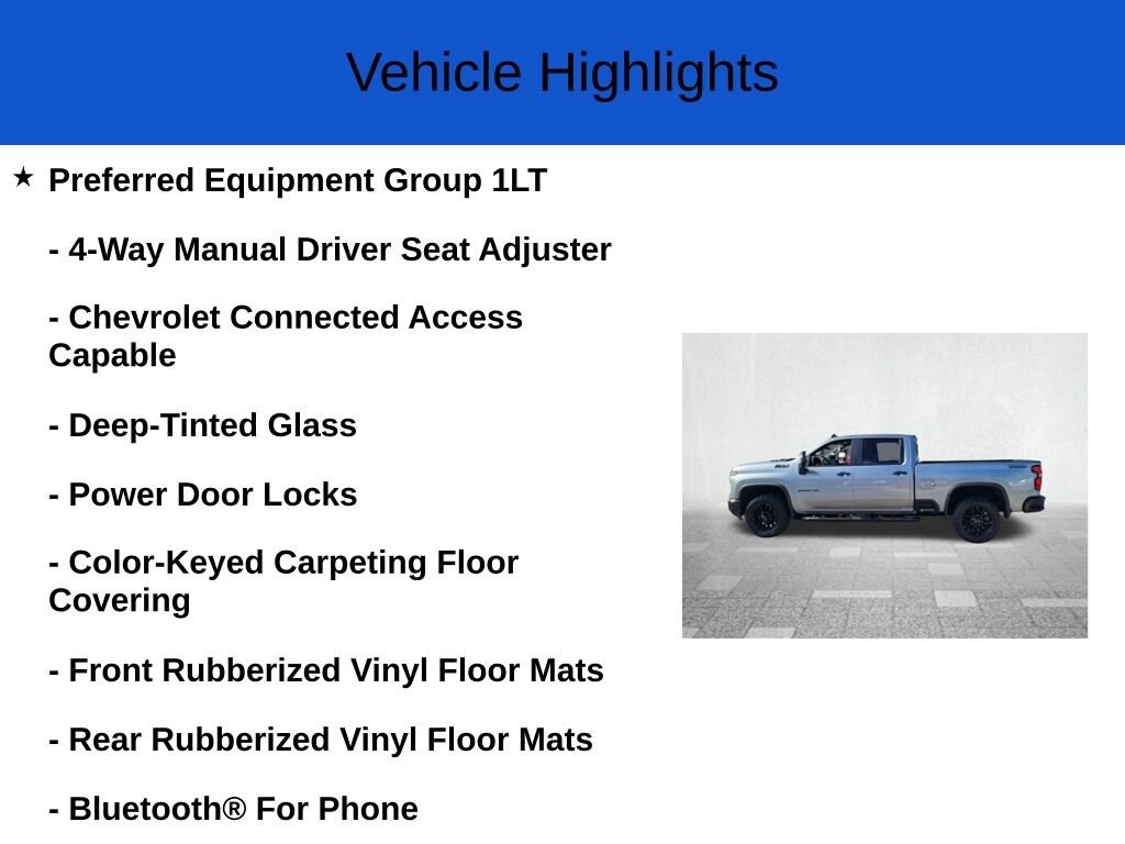 This Chevrolet Silverado 2500HD delivers a Turbocharged Diesel V8 6.6L/ engine powering this Automatic transmission. ENGINE, DURAMAX 6.6L TURBO-DIESEL V8 B20-Diesel compatible, (470 hp [350.5 kW] @ 2800 rpm, 975 lb-ft of torque [1322 Nm] @ 1600 rpm), Wireless phone projection for Apple CarPlay and Android Auto, Windows, power rear, express down (Not available with Regular Cab models.).