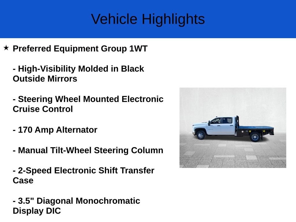 This Chevrolet Silverado 3500HD CC boasts a Turbocharged Diesel V8 6.6L/ engine powering this Automatic transmission. WT CONVENIENCE PACKAGE includes (AKO) tinted windows, (C49) rear-window defogger and (DBG) power trailer mirrors with heated upper glass and manual extending/folding, WORK TRUCK PREFERRED EQUIPMENT GROUP includes standard equipment, WINTER GRILLE COVER.