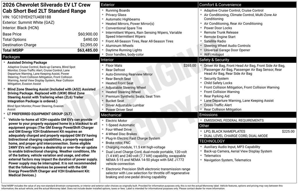 SUMMIT WHITE, SEATS, FRONT BUCKET (STD), LT PREFERRED EQUIPMENT GROUP includes Standard Equipment, LPO, BLACK NAMEPLATES (dealer-installed), LPO, ALL-WEATHER FLOOR LINERS first and second rows, (dealer-installed), ENGINE, NONE (STD), DUAL LEVEL CHARGE CORD, DUAL-MODE portable, 120-volt (1.4 kW) and 240-volt (7.7 kW) capability, swappable NEMA 5-15 and NEMA 14-50 plugs with SAE J1772 vehicle connection, BLACK, EVOTEX SEAT TRIM, Wireless Phone Charging, Wipers, front rain-sensing.