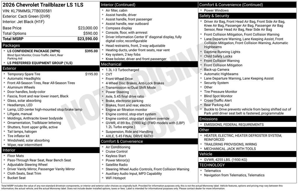 LS CONFIDENCE PACKAGE includes (UKC) Lane Change Alert with Side Blind Zone Alert, (UFG) Rear Cross Traffic Alert and (UD7) Rear Park Assist , TIRE, COMPACT SPARE 16" (40.3 CM) includes 16" (40.3 cm) spare wheel and (Q8E) mechanical jack with tools, SEATS, FRONT BUCKET (STD), REAR PARK ASSIST, REAR CROSS TRAFFIC ALERT, MECHANICAL JACK WITH TOOLS, LS PREFERRED EQUIPMENT GROUP includes Standard Equipment, LANE CHANGE ALERT WITH SIDE BLIND ZONE ALERT, JET BLACK, CLOTH SEAT TRIM, HEATER, ELECTRIC, HEATER DEFROSTER SYSTEM, REINFORCED.