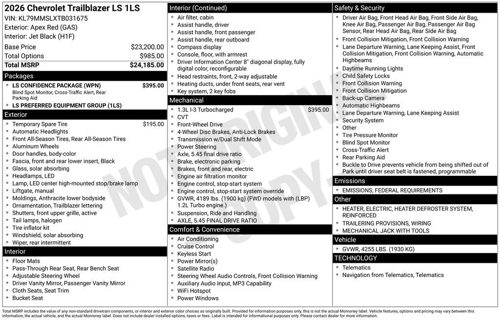 LS CONFIDENCE PACKAGE includes (UKC) Lane Change Alert with Side Blind Zone Alert, (UFG) Rear Cross Traffic Alert and (UD7) Rear Park Assist , TIRE, COMPACT SPARE 16" (40.3 CM) includes 16" (40.3 cm) spare wheel and (Q8E) mechanical jack with tools, SEATS, FRONT BUCKET (STD), REAR PARK ASSIST, REAR CROSS TRAFFIC ALERT, MECHANICAL JACK WITH TOOLS, LS PREFERRED EQUIPMENT GROUP includes Standard Equipment, LANE CHANGE ALERT WITH SIDE BLIND ZONE ALERT, JET BLACK, CLOTH SEAT TRIM, HEATER, ELECTRIC, HEATER DEFROSTER SYSTEM, REINFORCED.