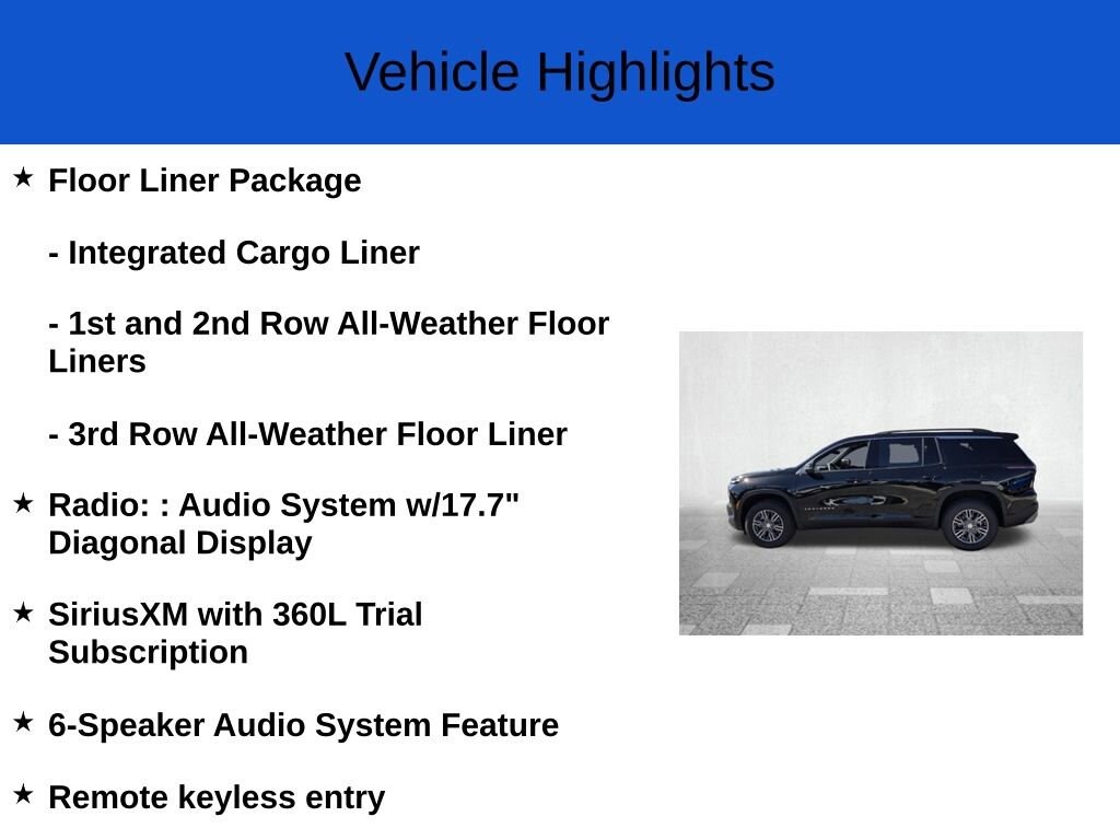 Wi-Fi Hotspot capable (Terms and limitations apply. See onstar.com or dealer for details.), Wheels, 18" (45.7 cm) Grazen Metallic machined-face aluminum, Wheel, spare, 18" (45.7 cm) steel, Wheel moldings, mold-in-color Black, Vehicle health management provides advanced warning of vehicle issues, USB ports, 2, one type A and one type-C data/charge, located in the front area of the center console, USB ports, 2 type-A, charge-only one on each outboard location, USB ports, 2 type-A, charge-only located on the rear of the center console, Transmission, 8-speed automatic, Tires, 255/65R18 all-season blackwall.