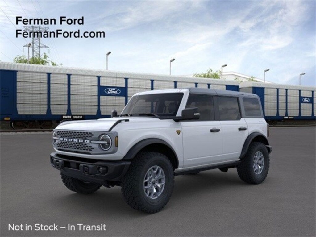 FIND IT AT FERMAN!, Free Delivery within 100 miles!, The 2025 Ford Bronco Badlands is a rugged, adventure-ready SUV built for serious off-road performance and all-terrain capability. As one of the most capable trims in the Bronco lineup, the Badlands features advanced off-road hardware, powerful engine options, and trail-focused technology. Under the hood, it comes standard with a 2.3L EcoBoost I-4 engine delivering 300 horsepower and 325 lb-ft of torque, with an available 2.7L EcoBoost V6 producing 330 horsepower and 415 lb-ft of torque. Both engines pair with either a 7-speed manual or 10-speed automatic transmission and standard 4x4 with part-time selectable engagement. The Badlands offers a towing capacity of up to 3,500 pounds and a maximum ground clearance of 11.5 inches when equipped with the Sasquatch Package. Off-road enhancements include the HOSS 2.0 suspension system with Bilstein position-sensitive dampers, a front stabilizer bar disconnect for maximum articulation, and seven G.O.A.T. Modes (Goes Over Any Terrain) that tailor performance to driving conditions. The available Sasquatch Package adds 35-inch all-terrain tires, beadlock-capable wheels, and high-clearance suspension. Inside, the Badlands offers a rugged yet comfortable cabin with durable marine-grade vinyl seating, rubberized flooring with drain plugs, and a MOLLE strap system on the seatbacks for additional storage. Technology features include a 12-inch SYNC 4 touchscreen, Apple CarPlay, Android Auto, and a digital instrument cluster. Safety and driver-assist features include a rearview camera, AdvanceTrac with Roll Stability Control, trailer sway control, and available systems such as blind spot monitoring, lane keeping assist, adaptive cruise control, and pre-collision assist. Available in both two-door and four-door body styles, the 2025 Bronco Badlands also offers roof options and new paint colors including Marsh Gray, Desert Sand, and Ruby Red. Optional packages like the Black Appearance or Free Wheeling add unique style elements. Designed to dominate rough terrain while maintaining modern comfort and connectivity, the 2025 Ford Bronco Badlands is a top choice for outdoor enthusiasts and trailblazers alike., 360-Degree Camera, Adaptive Cruise Control, Equipment Group 334A Lux Package, Evasive Steering Assist, Front Parking Sensors, Fully automatic headlights, Information on Demand Panel, Radio: B&O Sound System by Bang & Olufsen, Sideview Mirrors, Universal Garage Door Opener. Not all customers qualify for all rebates. Price includes. : $1500 - Retail Bonus Cash. Exp. 01/05/2026