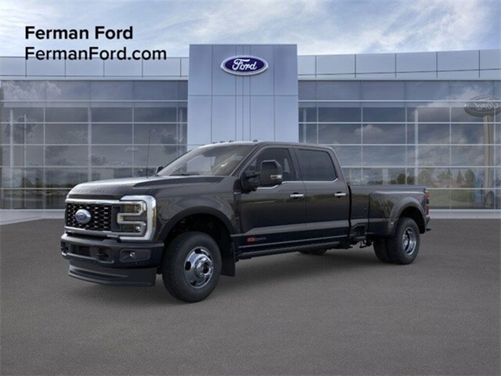 FIND IT AT FERMAN!, Free Delivery within 100 miles!, 2025 Ford F-350 Super Duty Platinum DRW 6.7 L High-Output Power Stroke Diesel Mighty Performance for the Toughest Jobs At its core is the legendary 6.7 L High-Output Power Stroke V8 Turbo Diesel, producing an impressive 500 horsepower and 1,200 lb-ft of torque. Paired with Fords TorqShift 10-speed automatic transmission, it delivers relentless pulling power and smooth performance under heavy load. Heavy-Duty Strength with Dual Rear Wheels Built on a dual-rear-wheel (DRW) platform, this Platinum edition Super Duty is engineered for ultimate stability and capability. When properly equipped, it can tow up to 38,000 pounds, making it one of the most capable heavy-duty pickups on the market. Payload ratings are equally strong, ensuring its ready for any challenge. Platinum Luxury Inside The Platinum trim surrounds you in premium comfort and craftsmanship. Highlights include luxurious leather seating, heated and ventilated front and rear seats, a heated steering wheel, and high-end trim accents. A large digital display with SYNC technology, wireless smartphone connectivity, premium audio, and advanced navigation create a refined, tech-forward cabin. Smart Work Features This truck doesnt just haulit works smarter. Trailer sway control, Pro Trailer Backup Assist, 360-degree camera, onboard scales with Smart Hitch, and multiple drive modes give drivers more confidence on the job or while towing a fifth-wheel or gooseneck trailer. Pro Power Onboard capability adds portable power, turning your truck into a jobsite or campsite generator. Why Choose the Platinum DRW High-Output Diesel? The 2025 F-350 Super Duty Platinum DRW combines unmatched diesel power with Platinum-level luxury. Its a truck for those who demand maximum towing strength, premium comfort, and advanced technologyall in one commanding package., 4WD, Camper Package, FX4 Off-Road Package, Hill Descent Control, Navigation system: Connected Navigation, Off-Road Specifically Tuned Shock Absorbers, Order Code 723A, Rear Stabilizer Bar & Auxiliary Springs, Unique FX4 Off-Road Box Decal.