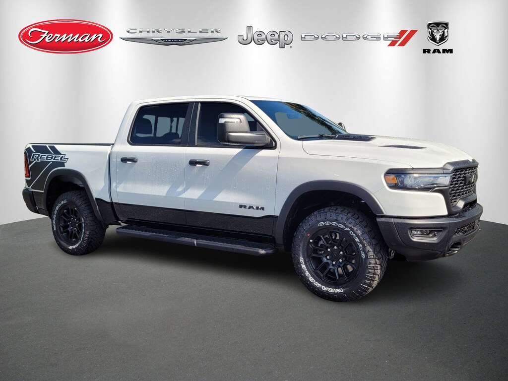 Bright White Clearcoat 2026 1500 Rebel 4WD 8-Speed Automatic 3.0L I6 10 Speakers, 3.92 Rear Axle Ratio, 4 Way Front Headrests, 4-Wheel Disc Brakes, 4G LTE Wi-Fi Hot Spot, ABS brakes, Accent Color Tailgate Handle, Air Conditioning, Alloy wheels, AM/FM radio: SiriusXM with 360L, Apple CarPlay, Apple CarPlay/Android Auto, Auto High-beam Headlights, Auto Power-Folding Mirrors, Auto-Dimming Exterior Driver Mirror, Auto-dimming Rear-View mirror, Automatic temperature control, Bed Utility Group, Black Exterior Mirrors, Black Premium Power Mirrors, Black Trailer Tow Power Mirrors, Brake assist, Bucket Seats, Cloth/Vinyl Bucket Seats, Compass, Connected Travel & Traffic Services, Connectivity - US/Canada, Convex Wide-Angle Exterior Mirror Insert, Delay-off headlights, Disassociated Touchscreen Display, Driver door bin, Driver vanity mirror, Dual front impact airbags, Dual front side impact airbags, Electronic Stability Control, Exterior 115V AC Outlet, Exterior Mirrors Courtesy Lamps, Exterior Mirrors w/Heating Element, Exterior Mirrors w/Supplemental Signals, Front anti-roll bar, Front Bucket Seats, Front Center Armrest w/Storage, Front dual zone A/C, Front fog lights, Front reading lights, Front Seat Back Map Pockets, Front wheel independent suspension, Full Length Upgraded Floor Console, Fully automatic headlights, Garage door transmitter, Global Telematics Box Module (TBM), Google Android Auto, GPS Antenna Input, GPS Navigation, HD Radio, Heated door mirrors, Heated Front Seats, Heated front seats, Heated Steering Wheel, Heated steering wheel, Illuminated entry, Integrated Center Stack Radio, Integrated Voice Command w/Bluetooth, Leather steering wheel, Low tire pressure warning, Manual Folding Exterior Mirrors, Manual Telescoping Mirrors, Manufacturer's Statement of Origin, Mirror Clearance/Running Lights, MOPAR 4 Adjustable Cargo Tie-Down Hooks, Mopar Black Tubular Side Steps, MOPAR Spray In Bedliner, Navigation System, Occupant sensing airbag, Off-Road Information Pages, Outside temperature display, Overhead airbag, Overhead console, Panic alarm, ParkView Rear Back-Up Camera, Passenger door bin, Passenger vanity mirror, Power 2-Way Driver Lumbar Adjust, Power Adjust 8-Way Driver Seat, Power Adjustable Pedals, Power door mirrors, Power driver seat, Power steering, Power windows, Power-Adjustable Convex Aux Mirrors, Quick Order Package 21W Rebel, Radio data system, Radio: Uconnect 5 Nav w/12.0" Display, RAM Tow Assist Kit, Rear 60/40 Folding Seat, Rear anti-roll bar, Rear seat center armrest, Rear step bumper, Rear Window Defroster, Rebel Level 1 Equipment Group, Remote keyless entry, Remote Tailgate Release, SiriusXM Radio Service, SiriusXM w/360L, Speed control, Split folding rear seat, Steering wheel mounted audio controls, Tachometer, Telescoping steering wheel, Tilt steering wheel, Traction control, Trailer Brake Control, Trailer Light Check, Trailer Reverse Steering Control, Trailer Tire Pressure Monitoring System, Trailer Tow Group, Trailer Tow Mirrors, Trip computer, USB Host Flip, Variably intermittent wipers, Voltmeter, Wheels: 18" x 8.0" Painted Mid-Gloss Black, Wireless Charging Pad. Price includes: $3500 - 2026 National Retail Consumer Cash . Exp. 11/03/2025
