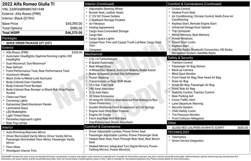*BLUETOOTH*, *BACK UP CAMERA*, *SUNROOF*, *LEATHER INTERIOR*, *NAVIGATION*, *USB, *FACTORY WARRANTY REMAINING*, *MOONROOF*, Giulia Ti 280 HP 2.0L Turbo I4 MOONROOF, 8 Speakers, Air Conditioning, Apple CarPlay/Android Auto, Automatic temperature control, Dual front impact airbags, Dual front side impact airbags, Emergency communication system: SiriusXM Guardian - included trial, Exterior Parking Camera Rear, Front Bucket Seats, Front dual zone A/C, Fully automatic headlights, Garage door transmitter, Gloss Red Calipers w/White Script, Heated front seats, Heated rear seats, Heated steering wheel, High intensity discharge headlights: Bi-Xenon, Knee airbag, Leather Seats, Navigation System, Occupant sensing airbag, Overhead airbag, Power driver seat, Power moonroof, Power passenger seat, Radio: AM/FM/HD 8.8 w/Navigation, Speed control, Steering wheel mounted audio controls, Wheels: 18 x 8.0 Dark Turbine Aluminum, 4-Wheel Disc Brakes, ABS brakes, Alloy wheels, AM/FM radio: SiriusXM, Auto High-beam Headlights, Auto-dimming door mirrors, Auto-dimming Rear-View mirror, Brake assist, Bumpers: body-color, Compass, Delay-off headlights, Driver door bin, Driver vanity mirror, Electronic Stability Control, Four wheel independent suspension, Front anti-roll bar, Front Center Armrest, Front reading lights, Genuine wood console insert, Genuine wood dashboard insert, Genuine wood door panel insert, Heated door mirrors, Illuminated entry, Leather Shift Knob, Leather steering wheel, Low tire pressure warning, Memory seat, Outside temperature display, Overhead console, Panic alarm, Passenger door bin, Passenger vanity mirror, Power door mirrors, Power steering, Power windows, Quick Order Package 22T, Radio data system, Rain sensing wipers, Rear anti-roll bar, Rear fog lights, Rear reading lights, Rear seat center armrest, Rear window defroster, Remote keyless entry, Security system, Silver Ti Badge, Speed-sensing steering, Speed-Sensitive Wipers, Split folding rear seat, Sport steering wheel, Tachometer, Telescoping steering wheel, Tilt steering wheel, Traction control, Trip computer, Turn signal indicator mirrors, Variably intermittent wipers, 21,570 MILES, 280 HP 2.0L Turbo I4, Giulia Ti 280 HP 2.0L Turbo I4 MOONROOF, 8 Speakers, Air Conditioning, Apple CarPlay/Android Auto, Automatic temperature control, Dual front impact airbags, Dual front side impact airbags, Emergency communication system: SiriusXM Guardian - included trial, Exterior Parking Camera Rear, Front Bucket Seats, Front dual zone A/C, Fully automatic headlights, Garage door transmitter, Gloss Red Calipers w/White Script, Heated front seats, Heated rear seats, Heated steering wheel, High intensity discharge headlights: Bi-Xenon, Knee airbag, Leather Seats, Navigation System, Occupant sensing airbag, Overhead airbag, Power driver seat, Power moonroof, Power passenger seat, Radio: AM/FM/HD 8.8 w/Navigation, Speed control, Steering wheel mounted audio controls, Wheels: 18 x 8.0 Dark Turbine Aluminum.
