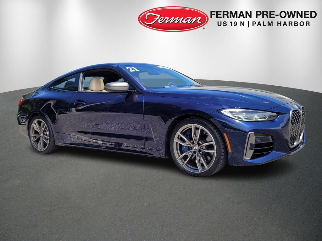CARFAX 1-OWNER VEHICLE, LOCAL TRADE, The 2021 BMW 4 Series M440i xDrive is a sleek, performance-focused luxury coupe that blends bold design, advanced technology, and exhilarating driving dynamics. Powered by a 3.0-liter BMW M TwinPower Turbo inline 6-cylinder engine with 48-volt mild-hybrid technology, it delivers an impressive 382 horsepower and 369 lb-ft of torque. Paired with an 8-speed Sport Automatic transmission and BMWs intelligent xDrive all-wheel-drive system, it sprints from 0 to 60 mph in just 4.3 seconds, offering confident traction and responsive handling in all conditions. The M Sport differential and adaptive M suspension fine-tune agility and stability, ensuring a precise and engaging drive. Visually, the M440i xDrive stands out with its controversial yet distinctive large kidney grilles, aerodynamic sculpting, and aggressive M Sport bodywork. Standard 18-inch M wheels (with available 19-inch upgrades), Shadowline exterior trim, and LED headlights with Laserlight options enhance its athletic stance. The coupes long hood, low roofline, and wide track embody BMWs performance heritage while signaling modern sophistication. Inside, the cabin offers a premium blend of driver-focused ergonomics and refined comfort. High-quality materials, such as Vernasca leather upholstery, aluminum or fine wood trim, and customizable ambient lighting, create an upscale atmosphere. The M leather steering wheel, bolstered sport seats, and digital displays reinforce its sporting character. The 12.3-inch Live Cockpit Professional digital instrument cluster and 10.25-inch central touchscreen run BMWs iDrive 7.0, integrating navigation, Apple CarPlay, Android Auto, and cloud-based voice control. Advanced safety and driver-assistance technologies include adaptive cruise control, lane-keeping assist, blind-spot monitoring, and parking sensors, with options for a full Driving Assistance Professional Package. Practicality is boosted by a surprisingly accommodating rear seat for a coupe and a decently sized trunk. The 2021 BMW M440i xDrive delivers an ideal mix of grand-touring comfort and track-inspired performance, making it a compelling choice for those who want luxury, technology, and driving excitement in one distinctive package., Adaptive M Suspension, Ambient Lighting, Connected Package Pro, Cooling & High Performance Tire Package, Head-Up Display, Heated Front Seats, Heated Steering Wheel, Increased Top Speed Limiter, Live Cockpit Pro w/Navi, M Technology Package, Mobility Kit, Premium Package (DISC), Wheels: 19 x 8 Fr & 19 x 8.5 Rr Jet Black.