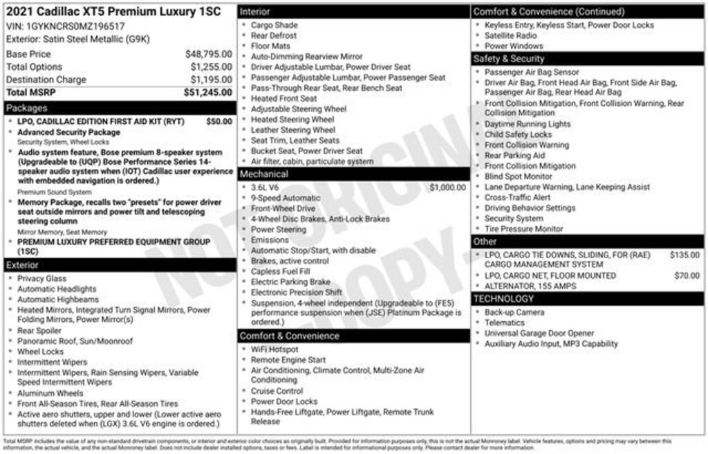 The 2021 Cadillac XT5 Premium Luxury stands as a refined expression of Cadillacs commitment to premium comfort, technology, and stylish design in the midsize luxury SUV segment. Positioned between the base Luxury trim and the more performance-oriented Sport variant, Premium Luxury serves as the ideal balance of upscale features and everyday practicality. Visually, the XT5 Premium Luxury presents a poised and elegant exterior. It typically rolls on 18-inch alloy wheels with a pearl nickel finish, and an available panoramic UltraView sunroof floods the cabin with natural light, enhancing the sense of space. LED lighting elements and crisp, sculpted body lines give it a modern, premium presence on the road. Cadillac Brochures +1 Inside, the cabin is richly appointed and thoughtfully designed for comfort. Leather seating surfaces are standard for both first and second rows, and available amenities like a memory-function drivers seat, heated features, and available ventilated seating help tailor comfort to individual tastes. A multi-zone climate system keeps passengers comfortable, while the roomy interior and flexible cargo area with around 63 cubic feet with seats folded add practicality for daily errands or weekend getaways. Cadillac Brochures +1 Under the hood, the Premium Luxury typically comes with a turbocharged 2.0-liter four-cylinder engine producing about 237 horsepower and 258 lb-ft of torque, paired with a smooth-shifting nine-speed automatic transmission. Cadillac offers the optional 3.6-liter V6 engine on this trim for those seeking stronger acceleration and towing capability. Both front-wheel drive and all-wheel drive are available, allowing buyers to choose the drivetrain that best fits their driving conditions. Edmunds +1 Technology is a strong point in the Premium Luxury. The cabin centers around an 8-inch touchscreen infotainment system featuring wireless Apple CarPlay and Android Auto, Bluetooth connectivity, voice recognition, and an available Bose audio system for immersive sound. A wireless charging pad, multiple USB ports, and convenience features like hands-free liftgate and rain-sensing wipers add to daily usability. CarsDirect +1 Safety and driver-assist features are more robust at this trim level. Standard enhancements like Lane Change Alert with Side Blind Zone Alert and Rear Cross Traffic Alert provide added awareness, while optional packages can introduce advanced systems such as adaptive cruise control, surround-view cameras with rear pedestrian alert, and automated parking assistance. Cadillac Brochures +1 In essence, the 2021 Cadillac XT5 Premium Luxury blends Cadillacs signature quiet ride and upscale interior with practical utility and modern connectivity. It appeals to buyers who want more refinement and comfort than the base model without stepping up to the sportiest (and most expensive) variant making it a compelling choice within the competitive luxury SUV market. Edmunds, Automatic Dual-Zone Climate Control, Automatic Emergency Braking, Dual Driver Info Center Display Gauge Cluster, Front & Rear Park Assist, HD Rear Vision Camera, Inside Rear-View Auto-Dimming Mirror, Premium Luxury Package 1SC, Teen Driver.
