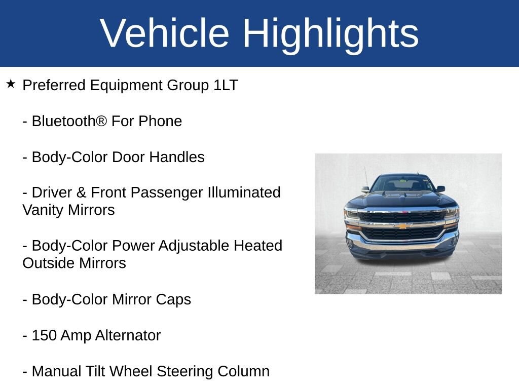Silverado 1500 LT LT1, 4D Crew Cab, EcoTec3 5.3L V8, 6-Speed Automatic Electronic with Overdrive, RWD, Black, Black Leather, 110-Volt AC Power Outlet, 150 Amp Alternator, 4.2 Diagonal Color Display Driver Info Center, 6 Speaker Audio System, All Star Edition, Bluetooth® For Phone, Body Color Bodyside Moldings, Body-Color Door Handles, Body-Color Mirror Caps, Body-Color Power Adjustable Heated Outside Mirrors, Chevrolet Connected Access, Chevrolet w/4G LTE, Chrome Grille Surround, Color-Keyed Carpeting w/Rubberized Vinyl Floor Mats, Deep-Tinted Glass, Driver & Front Passenger Illuminated Vanity Mirrors, Dual-Zone Automatic Climate Control, Electric Rear-Window Defogger, EZ Lift & Lower Tailgate, Front Chrome Bumper, HD Radio, Heavy-Duty Rear Locking Differential, Leather Wrapped Steering Wheel w/Cruise Controls, Manual Tilt Wheel Steering Column, OnStar & Chevrolet Connected Services Capable, Power Windows w/Driver Express Up, Preferred Equipment Group 1LT, Rear 60/40 Folding Bench Seat (Folds Up), Rear Chrome Bumper, Rear Wheelhouse Liners, Remote Keyless Entry, Remote Locking Tailgate, Remote Vehicle Starter System, Single Slot CD/MP3 Player, Steering Wheel Audio Controls, Theft Deterrent System (Unauthorized Entry), Thin Profile LED Fog Lamps, Trailering Package.