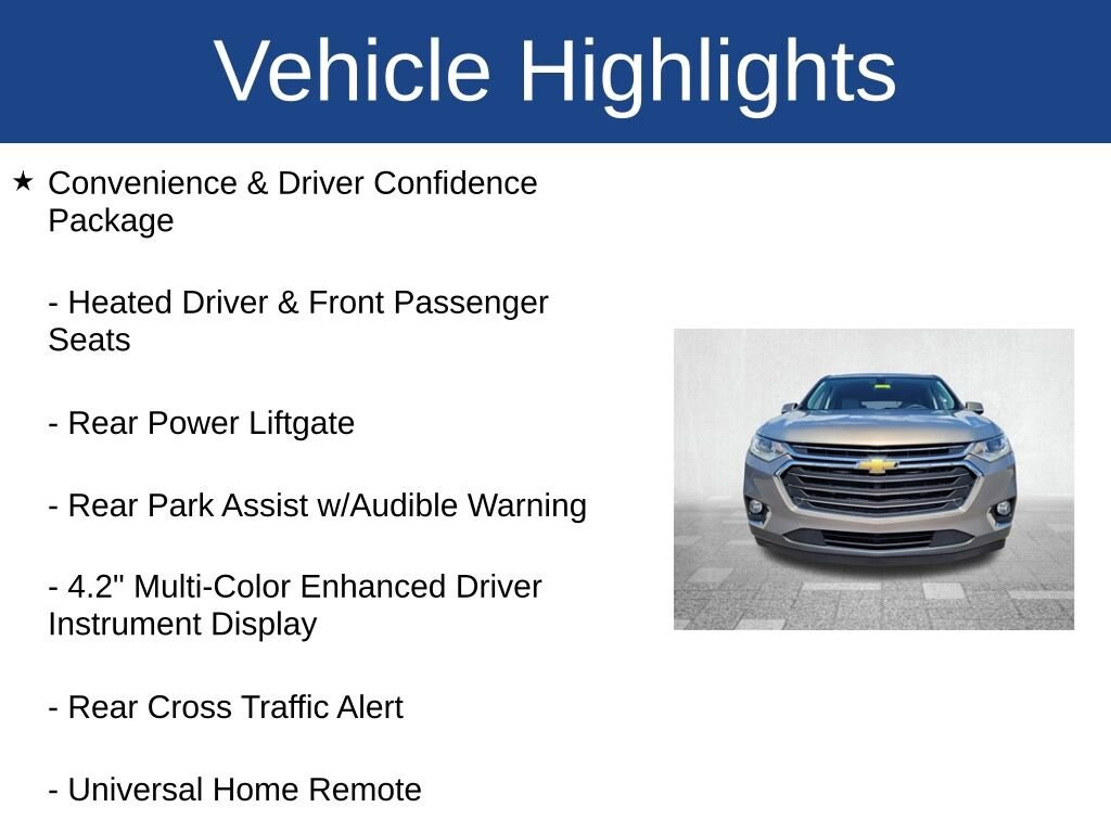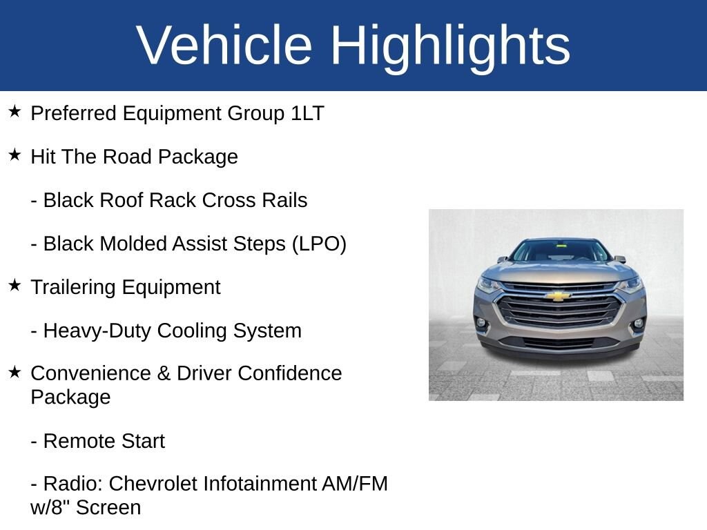 Traverse LT Cloth w/1LT, 4D Sport Utility, 3.6L V6 SIDI VVT, 9-Speed Automatic, FWD, Pepperdust Metallic, Dark Atmosphere/Medium Ash Gray Cloth, 3rd Row All-Weather Floor Liner (LPO), 4.2 Multi-Color Enhanced Driver Instrument Display, Alloy wheels, Black Molded Assist Steps (LPO), Black Roof Rack Cross Rails, Convenience & Driver Confidence Package, Heated Driver & Front Passenger Seats, Heavy-Duty Cooling System, Hit The Road Package, Lane Change Alert w/Side Blind Zone Alert, Preferred Equipment Group 1LT, Radio: Chevrolet Infotainment AM/FM w/8 Screen, Rear Cross Traffic Alert, Rear Park Assist w/Audible Warning, Rear Power Liftgate, Remote Start, SiriusXM Radio, Trailering Equipment, Universal Home Remote.