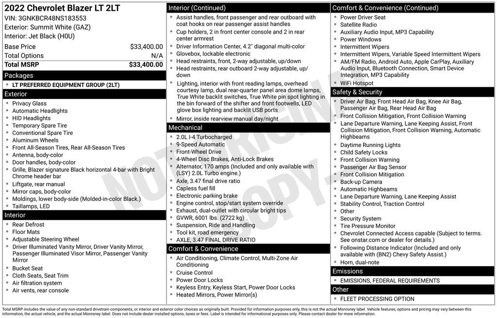2022 Chevrolet Blazer LT LT Preferred Equipment Group 2LT, 170 Amp Alternator, 3.47 Final Drive Axle Ratio, 4-Wheel Disc Brakes, 6 Speakers, 6-Speaker Audio System Feature, ABS brakes, Air Conditioning, Alloy wheels, AM/FM radio: SiriusXM, Apple CarPlay/Android Auto, Auto High-beam Headlights, Automatic temperature control, Brake assist, Bumpers: body-color, Child-Seat-Sensing Airbag, Compass, Delay-off headlights, Driver door bin, Driver vanity mirror, Dual front impact airbags, Dual front side impact airbags, Electronic Stability Control, Emergency communication system: OnStar and Chevrolet connected services capable, Exterior Parking Camera Rear, Four wheel independent suspension, Front anti-roll bar, Front Bucket Seats, Front Center Armrest, Front dual zone A/C, Front reading lights, Fully automatic headlights, Heated door mirrors, High-Intensity Discharge Headlights, Illuminated entry, Knee airbag, Leather Shift Knob, Low tire pressure warning, Occupant sensing airbag, Outside temperature display, Overhead airbag, Overhead console, Panic alarm, Passenger door bin, Passenger vanity mirror, Power door mirrors, Power driver seat, Power steering, Power windows, Premium Cloth Seat Trim, Radio data system, Radio: Chevrolet Infotainment 3 System, Rear anti-roll bar, Rear reading lights, Rear seat center armrest, Rear window defroster, Rear window wiper, Remote keyless entry, Ride & Handling Suspension, Security system, SiriusXM Radio, Speed control, Speed-sensing steering, Split folding rear seat, Spoiler, Steering wheel mounted audio controls, Tachometer, Telescoping steering wheel, Tilt steering wheel, Traction control, Trip computer, Variably intermittent wipers, Voltmeter, Wheels: 18 Bright Silver Aluminum, Preferred Equipment Group 2LT.