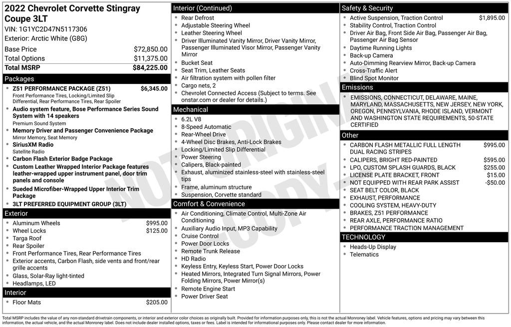 *BLUETOOTH*, *BACK UP CAMERA*, *CLEAN CARFAX*, APPLE CarPlay/ANDROID AUTO, *LEATHER INTERIOR*, *USB, *FACTORY WARRANTY REMAINING*, Corvette Stingray 3LT, 8-Way Power Driver Seat Adjuster, 8-Way Power Passenger Seat Adjuster, Air Conditioning, Apple CarPlay/Android Auto, Automatic temperature control, Body-Color Removeable Roof Panel, Bose Performance Series Sound System w/14 Speakers, Bright Red-Painted Calipers, Carbon Flash Metallic Dual Racing Stripes, Custom Leather Wrapped Interior Package, Dual front impact airbags, Dual front side impact airbags, Electrical Theft Deterrent System, Electronic Limited-Slip Differential, Emergency communication system: OnStar and Chevrolet connected services capable, Front dual zone A/C, Fully automatic headlights, Garage door transmitter, GT2 Bucket Seats, HD Front & Rear Vision Cameras, Head-Up Display, Heated & Vented Driver & Passenger Seats, Heated front seats, Heated Steering Wheel, Heavy-Duty Cooling System, Memory Driver & Passenger Convenience Package, Napa Lthr Seating Surfaces w/Perforated Inserts, Navigation System, Occupant sensing airbag, Performance Data & Video Recorder, Performance Exhaust w/Stainless-Steel Tips, Performance Rear Axle Ratio, Power driver seat, Power passenger seat, Power-Adjustable Outside Heated Mirrors, Preferred Equipment Group 3LT, Premium audio system: Chevrolet Infotainment 3 Premium, Radio: Chevrolet Infotainment 3 Premium System, Rear Camera Mirror, Rear Cross Traffic Alert, Rear Park Assist, Rear Parking Sensors, Rear Z51 Spoiler, Side Blind Zone Alert, SiriusXM Radio, Speed control, Steering wheel mounted audio controls, Universal Home Remote, Vehicle Inclination Theft Deterrent Sensor, Vehicle Interior Movement Theft Deterrent Sensor, Ventilated front seats, Wireless Charging for Devices, Z51 Perf Suspension w/Magnetic Selective Ride Cntrl, Z51 Performance Brakes, Z51 Performance Package, Z51 Performance Suspension, 14 Speakers, 2 Cargo Nets, 4-Wheel Disc Brakes, ABS brakes, All-Weather Floor Liners w/Jake Logo (LPO), Alloy wheels, AM/FM radio: SiriusXM, Auto-dimming door mirrors, Auto-dimming Rear-View mirror, Black Custom Splash Guards (LPO), Black Wheel Locks (LPO), Brake assist, Bumpers: body-color, Compass, Delay-off headlights, Driver door bin, Driver Power Bolster Seat Adjuster, Driver vanity mirror, Electronic Stability Control, Four wheel independent suspension, Front anti-roll bar, Front Bucket Seats, Front Center Armrest, Front License Plate Bracket, Front reading lights, HD Radio, Heads-Up Display, Heated door mirrors, Heated steering wheel, Illuminated entry, Jake Logo Wheel Center Caps (LPO), Leather Shift Knob, Leather steering wheel, Low tire pressure warning, Memory seat, Not Equipped w/Rear Park Assist (DISC), Outside temperature display, Overhead console, Panic alarm, Passenger door bin, Passenger Power Bolster Seat Adjuster, Passenger vanity mirror, Performance Traction Management, Power door mirrors, Power Driver Lumbar Control Seat Adjuster, Power Passenger Lumbar Control Seat Adjuster, Power steering, Power windows, Radio data system, Rear anti-roll bar, Rear window defroster, Remote keyless entry, Security system, Speed-sensing steering, Sport steering wheel, Steering wheel memory, Sueded Microfiber-Wrapped Upper Interior Trim Pkg, Tachometer, Telescoping steering wheel, Tilt steering wheel, Traction control, Trip computer, Turn signal indicator mirrors, Variably intermittent wipers, Voltmeter, 18,068 MILES, AIR CONDITIONING, DUAL-ZONE CLIMATE CONTROL, REAR CAMERA MIRROR, Z51 PERFORMANCE SUSPENSION W/ MAGNETIC SELECTIVE RIDE CONTROL, CHEVROLET INFOTAINMENT 3 PREMIUM SYSTEM W/NAVIGATION & PERFORMANCE DATA RECORDER, BRIGHT RED PAINTED BRAKE CALIPERS, HEATED STEERING WHEEL, PERFORMANCE EXHAUST, CARBON FLASH PAINTED ALUMINUM WHEELS WITH MACHINED EDGE, REAR CROSS TRAFFIC ALERT, HD FRONT/REAR VISION CAMERAS (FRONT CAMERA IS CURB VIEW), Z51 PERFORMANCE PACKAGE: * REAR AXLE, PERFORMANCE RATIO * HIGH PERFORMANCE TIRES * SPOILER,