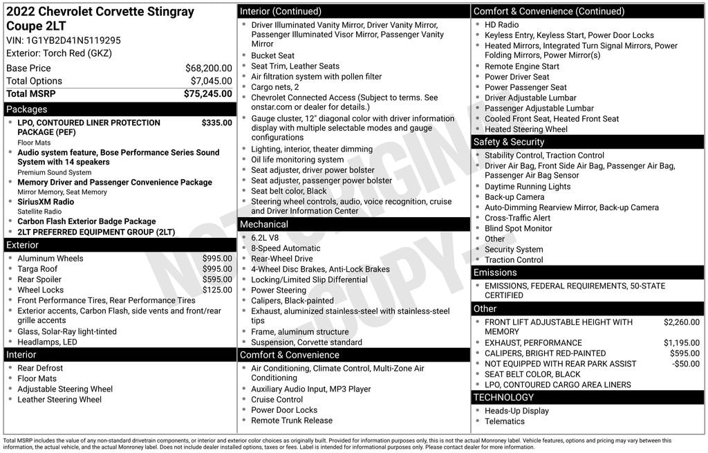 *BLUETOOTH*, *BACK UP CAMERA*, *CLEAN CARFAX*, APPLE CarPlay/ANDROID AUTO, *LEATHER INTERIOR*, *NAVIGATION*, *USB, *FACTORY WARRANTY REMAINING*, Corvette Stingray 2LT, 8-Way Power Driver Seat Adjuster, 8-Way Power Passenger Seat Adjuster, Air Conditioning, Apple CarPlay/Android Auto, Automatic temperature control, Bose Performance Series Sound System w/14 Speakers, Bright Red-Painted Calipers, Dual front impact airbags, Dual front side impact airbags, Electrical Theft Deterrent System, Emergency communication system: OnStar and Chevrolet connected services capable, Front Bucket Seats, Front dual zone A/C, Front Lift Adjustable Height w/Memory, Fully automatic headlights, Garage door transmitter, GT1 Bucket Seats, HD Front & Rear Vision Cameras, Head-Up Display, Heated & Vented Driver & Passenger Seats, Heated front seats, Heated Steering Wheel, Low-Profile Rear Spoiler & Front Splitter, Memory Driver & Passenger Convenience Package, Mulan Lthr Seating Surfaces w/Perforated Inserts, Navigation System, Occupant sensing airbag, Passenger Power Bolster Seat Adjuster, Performance Data & Video Recorder, Performance Exhaust w/Stainless-Steel Tips, Power Driver Lumbar Control Seat Adjuster, Power driver seat, Power Passenger Lumbar Control Seat Adjuster, Power passenger seat, Power-Adjustable Outside Heated Mirrors, Preferred Equipment Group 2LT, Premium audio system: Chevrolet Infotainment 3 Premium, Radio: Chevrolet Infotainment 3 Premium System, Rear Camera Mirror, Rear Cross Traffic Alert, Rear Park Assist, Rear Parking Sensors, Side Blind Zone Alert, SiriusXM Radio, Speed control, Steering wheel mounted audio controls, Transparent Removable Roof Panel, Universal Home Remote, Vehicle Inclination Theft Deterrent Sensor, Vehicle Interior Movement Theft Deterrent Sensor, Ventilated front seats, Wireless Charging for Devices, 14 Speakers, 4-Wheel Disc Brakes, ABS brakes, Alloy wheels, AM/FM radio: SiriusXM, Auto-dimming door mirrors, Auto-dimming Rear-View mirror, Black Wheel Locks (LPO), Brake assist, Bumpers: body-color, Compass, Delay-off headlights, Driver door bin, Driver Power Bolster Seat Adjuster, Driver vanity mirror, Electronic Stability Control, Four wheel independent suspension, Front anti-roll bar, Front Center Armrest, Front reading lights, HD Radio, Heads-Up Display, Heated door mirrors, Heated steering wheel, Illuminated entry, Leather Shift Knob, Leather steering wheel, Low tire pressure warning, Memory seat, Outside temperature display, Overhead console, Panic alarm, Passenger door bin, Passenger vanity mirror, Power door mirrors, Power steering, Power windows, Radio data system, Rear anti-roll bar, Rear window defroster, Remote keyless entry, Security system, Speed-sensing steering, Sport steering wheel, Steering wheel memory, Tachometer, Telescoping steering wheel, Tilt steering wheel, Traction control, Trip computer, Turn signal indicator mirrors, Variably intermittent wipers, Voltmeter, Wheels: 19 x 8.5 Fr/20 x 11 Rr Carbon Flash, 20,645 MILES, AIR CONDITIONING, DUAL-ZONE CLIMATE CONTROL, ADJUSTABLE HEIGHT FRONT LIFT w/ MEMORY, MECHANICAL LIMITED SLIP DIFFERENTIAL, HEATED STEERING WHEEL, CARBON FLASH PAINTED ALUMINUM WHEELS WITH MACHINED EDGE, REAR CROSS TRAFFIC ALERT, PERFORMANCE DATA AND VIDEO RECORDER, HD FRONT/REAR VISION CAMERAS (FRONT CAMERA IS CURB VIEW), HEAD-UP DISPLAY, BOSE PERFORMANCE SERIES 14 SPEAKER AUDIO SYSTEM, SIDE BLIND ZONE ALERT, REAR PARK ASSIST, PERFORMANCE EXHAUST, POWER TILT AND TELESCOPIC STEERING COLUMN, WIRELESS CHARGING, BRIGHT RED PAINTED BRAKE CALIPERS, REAR CAMERA MIRROR, TRANSPARENT REMOVABLE ROOF PANEL, Corvette Stingray 2LT, 8-Way Power Driver Seat Adjuster, 8-Way Power Passenger Seat Adjuster, Air Conditioning, Apple CarPlay/Android Auto, Automatic temperature control, Bose Performance Series Sound System w/14 Speakers, Bright Red-Painted Calipers, Dual front impact airbags, Dual front side impact airbags, Electrical Theft Deterrent System, Emergency communication system: O