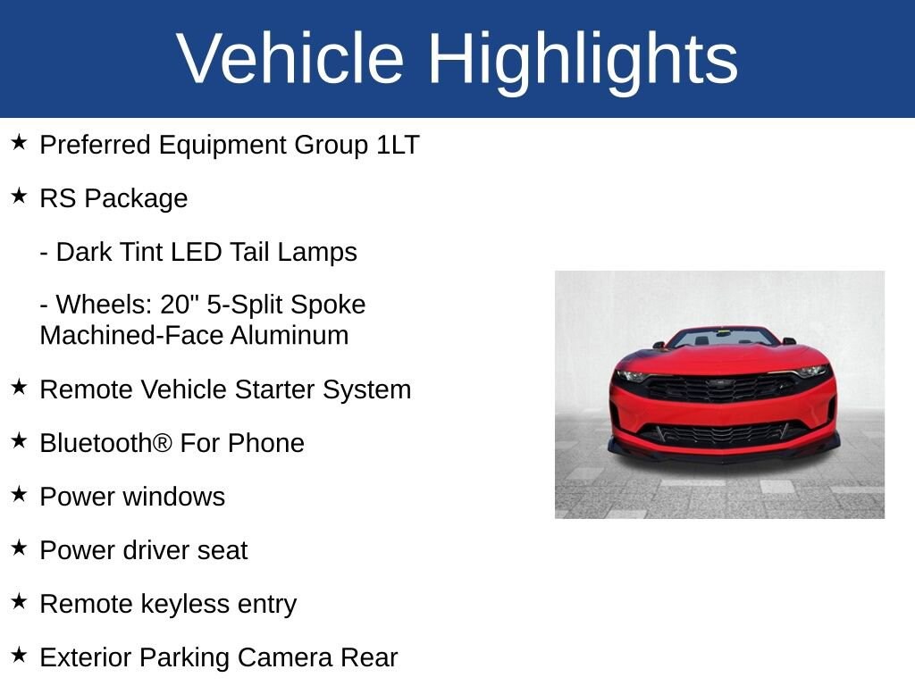Camaro 1LT, 2D Convertible, 2.0L Turbocharged, 8-Speed Automatic, RWD, Red Hot, Jet Black Cloth, Apple CarPlay/Android Auto, Bluetooth® For Phone, Dark Tint LED Tail Lamps, Exterior Parking Camera Rear, Power driver seat, Power windows, Preferred Equipment Group 1LT, Remote keyless entry, Remote Vehicle Starter System, RS Package, Wheels: 20 5-Split Spoke Machined-Face Aluminum.