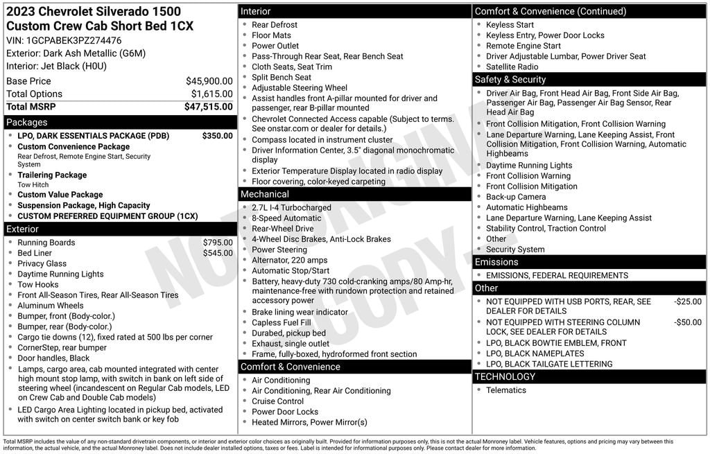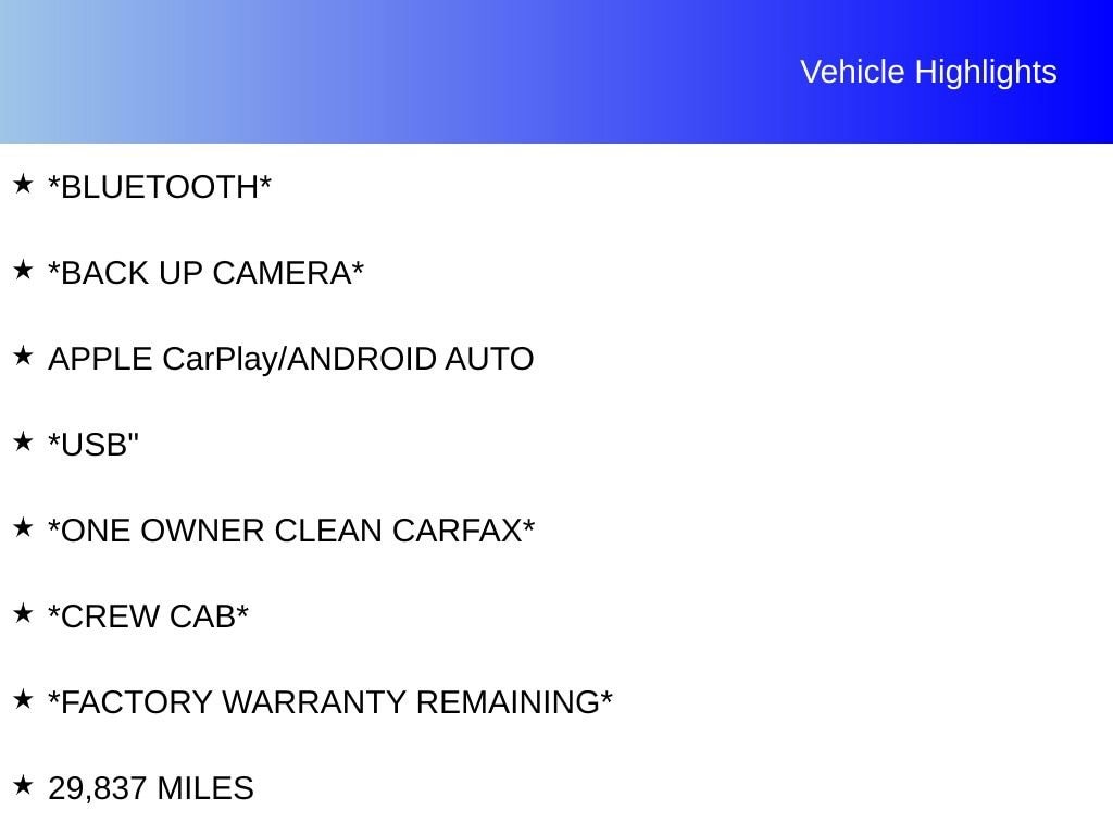 *BLUETOOTH*, *BACK UP CAMERA*, APPLE CarPlay/ANDROID AUTO, *USB, *ONE OWNER CLEAN CARFAX*, *CREW CAB*, *FACTORY WARRANTY REMAINING*, Silverado 1500 Custom, 8-Speed Automatic, Jet Black Cloth, 10-Way Power Driver Seat w/Lumbar, 120-Volt Bed Mounted Power Outlet, 120-Volt Instrument Panel Power Outlet, 4 Black Round Assist Steps (LPO), 6-Speaker Audio System, Air Conditioning, Apple CarPlay/Android Auto, Automatic Emergency Braking, Black Name Plates (LPO), Bluetooth® For Phone, Chevrolet Connected Access Capable, Chevytec Spray-On Black Bedliner, Cloth Seat Trim, Custom Convenience Package, Custom Value Package, Dark Essentials Package (LPO), Dual front impact airbags, Dual front side impact airbags, Forward Collision Alert, Front Pedestrian Braking, Fully automatic headlights, HD Rear Vision Camera, Hitch Guidance, Lane Keep Assist w/Lane Departure Warning, LED Cargo Area Lighting, Occupant sensing airbag, OnStar & Chevrolet Connected Services Capable, Overhead airbag, Power driver seat, Preferred Equipment Group 1CX, Premium audio system: Chevrolet Infotainment 3, Radio: Chevrolet Infotainment 3 System, Remote Vehicle Starter System, SiriusXM Radio, Speed control, Theft Deterrent System (Unauthorized Entry), Trailering Package, Wheels: 20 x 9 High Gloss Black Painted Alum, Wireless Phone Projection, 3.42 Rear Axle Ratio, 3.5 Monochromatic Display Driver Info Center, 4-Wheel Disc Brakes, 40/20/40 Front Split-Bench Seat, 6 Speakers, ABS brakes, Alloy wheels, AM/FM radio: SiriusXM, Auto High-beam Headlights, Black Tailgate CHEVROLET Lettering (LPO), Brake assist, Bumpers: body-color, Color-Keyed Carpeting Floor Covering, Compass, Deep-Tinted Glass, Delay-off headlights, Driver door bin, Driver vanity mirror, Electric Rear-Window Defogger, Electronic Cruise Control, Electronic Stability Control, EZ Lift Power Lock & Release Tailgate, Following Distance Indicator, Front anti-roll bar, Front Black Bowtie Emblem (LPO), Front Center Armrest w/Storage, Front Frame-Mounted Black Recovery Hooks, Front reading lights, Front Rubberized Vinyl Floor Mats, Front wheel independent suspension, Heated door mirrors, High Capacity Suspension Package, Illuminated entry, IntelliBeam Automatic High Beam On/Off, Low tire pressure warning, Manual Tilt Wheel Steering Column, Manual Tilt/Telescoping Steering Column (DISC), Not Equipped w/Rear USB Ports, Not Equipped w/Steering Column Lock, Outside temperature display, Overhead console, Panic alarm, Passenger door bin, Passenger vanity mirror, Power door mirrors, Power Front Windows w/Driver Express Up/Down, Power Front Windows w/Passenger Express Down, Power Rear Windows w/Express Down, Power steering, Power windows, Radio data system, Rear 60/40 Folding Bench Seat (Folds Up), Rear reading lights, Rear Rubberized-Vinyl Floor Mats, Rear step bumper, Rear window defroster, Remote Keyless Entry, Remote keyless entry, Security system, Speed-sensing steering, Split folding rear seat, Standard Tailgate, Tachometer, Tilt steering wheel, Traction control, Trip computer, Variably intermittent wipers, Voltmeter, Wi-Fi Hot Spot Capable, 29,837 MILES, BLACK ASSIST STEPS, CHEVYTEC SPRAY-ON BEDLINER, AUTOMATIC EMERGENCY BRAKING, FORWARD COLLISION ALERT, FRONT PEDESTRIAN BRAKING, LANE KEEP ASSIST W/LANE DEPARTURE WARNING, REAR VISION CAMERA, Silverado 1500 Custom, 8-Speed Automatic, Jet Black Cloth, 10-Way Power Driver Seat w/Lumbar, 120-Volt Bed Mounted Power Outlet, 120-Volt Instrument Panel Power Outlet, 4 Black Round Assist Steps (LPO), 6-Speaker Audio System, Air Conditioning, Apple CarPlay/Android Auto, Automatic Emergency Braking, Black Name Plates (LPO), Bluetooth® For Phone, Chevrolet Connected Access Capable, Chevytec Spray-On Black Bedliner, Cloth Seat Trim, Custom Convenience Package, Custom Value Package, Dark Essentials Package (LPO), Dual front impact airbags, Dual front side impact airbags, Forward Collision Alert, Front Pedestrian Braking, Fully automatic headlights, HD Rear Vision Camera, Hit