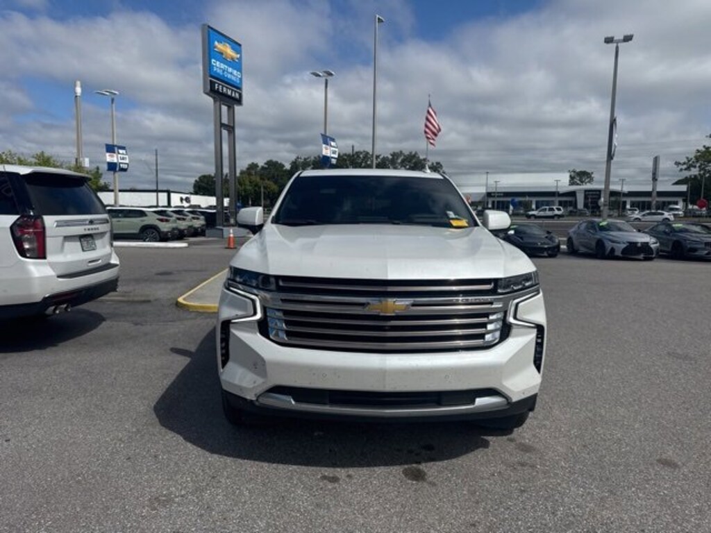 Chevrolet Certified Pre-Owned Certified, 10 Speakers, 15 Diagonal Multi-Color Head-Up Display, 1st & 2nd Row Color-Keyed Carpeted Floor Mats, 3.23 Rear Axle Ratio, 3rd Row 60/40 Power-Folding Split-Bench, 3rd row seats: split-bench, 4-Wheel Disc Brakes, ABS brakes, Adaptive Cruise Control, Adaptive suspension, Advanced Trailering Package, Air Conditioning, Air Ride Adaptive Suspension, Alloy wheels, AM/FM radio: SiriusXM with 360L, Apple CarPlay/Android Auto, Auto High-beam Headlights, Auto-dimming door mirrors, Auto-dimming Rear-View mirror, Auto-leveling suspension, Automatic temperature control, Bose 10-Speaker Surround w/CenterPoint, Brake assist, Bright Front & Rear Door Sill Plates, Bumpers: body-color, Chrome Door Handles w/Body-Color Strip, Color-Keyed Carpeting Floor Covering, Compass, Delay-off headlights, Driver & Front Outboard Passenger Airbags, Driver door bin, Driver vanity mirror, Dual Exhaust System, Dual front impact airbags, Dual front side impact airbags, Dual-Pane Power Panoramic Sunroof, Electronic Stability Control, Emergency communication system: OnStar and Chevrolet connected services capable, Enhanced Automatic Emergency Braking, Enhanced Driver Information Center, Exterior Parking Camera Rear, Extra Capacity Cooling System, Floor Console, Four wheel independent suspension, Front anti-roll bar, Front Bucket Seats, Front Center Armrest, Front dual zone A/C, Front reading lights, Fully automatic headlights, Garage door transmitter, Hands-Free Rear Power Programmable Liftgate, HD Surround Vision, Heads-Up Display, Heated & Ventilated Driver & Front Passenger Seats, Heated 2nd Row Outboard Seats, Heated door mirrors, Heated Driver & Front Passenger Seats, Heated front seats, Heated rear seats, Heated Steering Wheel, Heated steering wheel, High Country Deluxe, Hitch Guidance w/Hitch View, Illuminated entry, Infotainment Display, Inside Rearview Auto-Dimming Rear Camera Mirror, Integrated Trailer Brake Controller, Lane Change Alert w/Side Blind Zone Alert, LED Daytime Running Lamps, Low tire pressure warning, Magnetic Ride Control Suspension, Max Trailering Package, Memory seat, Memory Settings, Navigation System, Not Equipped w/Wheel Locks (LPO), Occupant sensing airbag, Outside Heated Power-Adjustable Mirrors, Outside temperature display, Overhead airbag, Overhead console, Panic alarm, Passenger door bin, Passenger vanity mirror, Perforated Leather Seating Surfaces, Power door mirrors, Power driver seat, Power Liftgate, Power passenger seat, Power Release 2nd Row Bucket Seats, Power steering, Power Tilt & Telescopic Steering Column, Power windows, Power-Retractable Assist Steps, Preferred Equipment Group 3LZ, Premium audio system: Chevrolet Infotainment 3 Premium, Radio: Chevrolet Infotainment 3 Premium System, Rain sensing wipers, Rear air conditioning, Rear anti-roll bar, Rear Camera Mirror Washer, Rear Cross Traffic Alert, Rear Pedestrian Alert, Rear reading lights, Rear window defroster, Rear window wiper, Remote keyless entry, Remote Start, Roof rack: rails only, Safety Alert Seat, Security system, SiriusXM Radio w/360L, Smart Trailer Integration Indicator, Speed control, Speed-sensing steering, Split folding rear seat, Spoiler, Steering wheel memory, Steering wheel mounted audio controls, Tachometer, Telescoping s