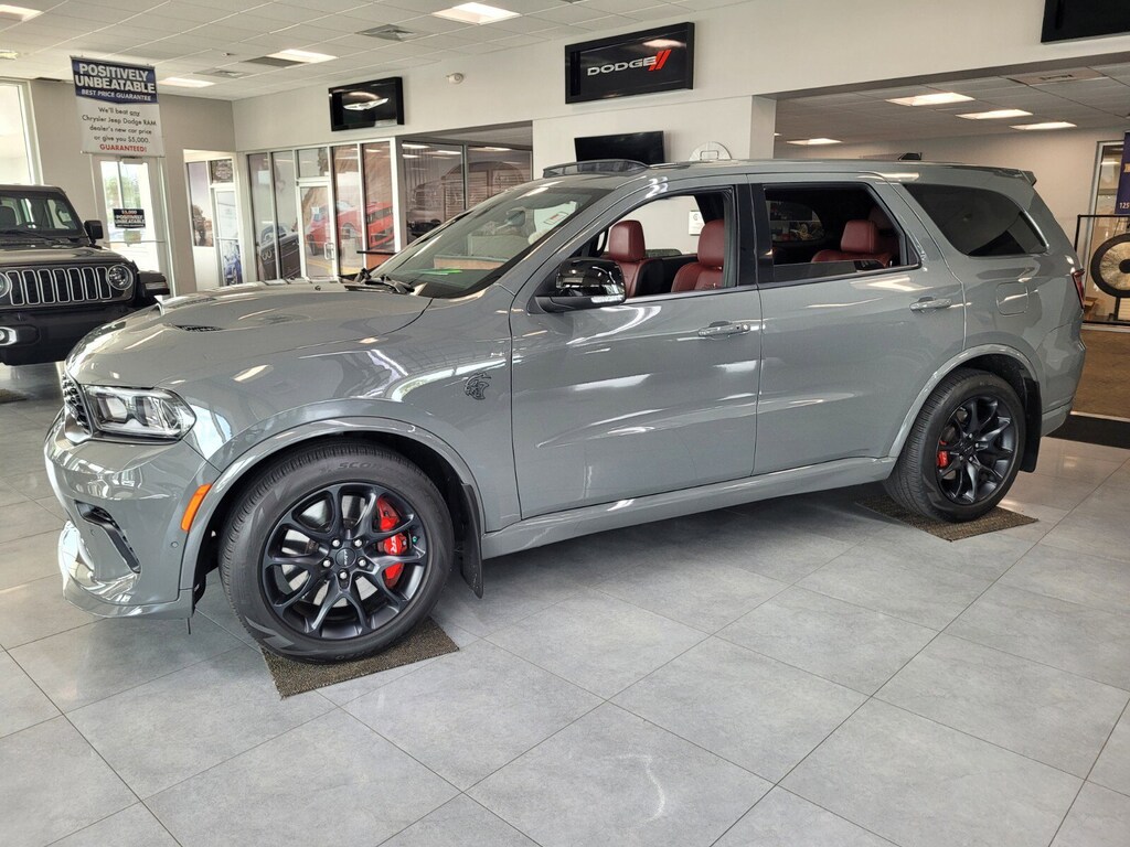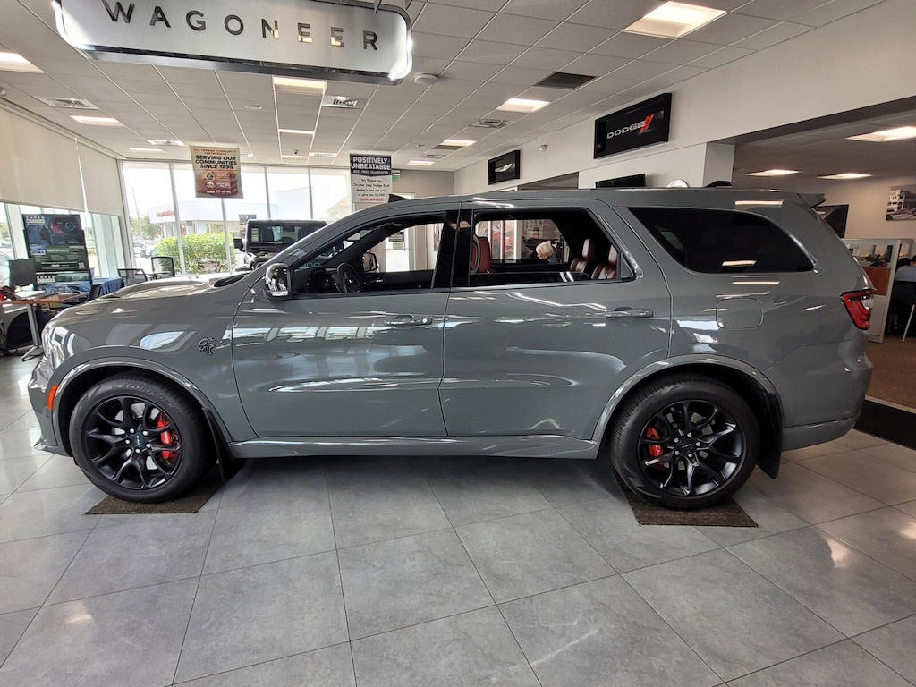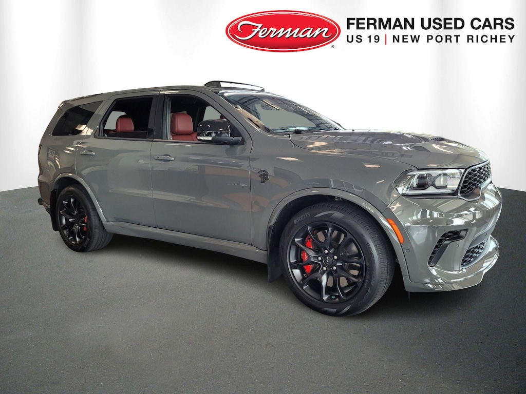 *CLEAN CARFAX*, *APPLE CarPlay/ANDROID AUTO*, *BLIND SPOT MONITOR*, *BACK UP CAMERA*, *WI-FI HOTSPOT*, *USB/HANDS FREE/GPS BLUETOOTH*, *SUNROOF/MOONROOF*, *LEATHER*, Durango SRT Hellcat Black, 4D Sport Utility, 6.2L Supercharged HEMI V8 SRT, 8-Speed Automatic, AWD, Destroyer Gray Clearcoat, 3.70 Rear Axle Ratio, 3rd row seats: split-bench, 4-Wheel Disc Brakes, 7 & 4 Pin Wiring Harness, 9 Speakers, ABS brakes, Adaptive Cruise Control w/Stop, Advanced Brake Assist, Air Conditioning, Alloy wheels, AM/FM radio: SiriusXM w/360L, Apple CarPlay/Android Auto, Audio memory, Auto High-beam Headlights, Auto-dimming door mirrors, Auto-dimming Rear-View mirror, Automatic temperature control, Black Package, Brake assist, Bumpers: body-color, Class IV Receiver Hitch, Compass, Delay-off headlights, Driver door bin, Driver vanity mirror, Dual front impact airbags, Dual front side impact airbags, Eclipse Black Exhaust Tip, Electronic Stability Control, Emergency communication system: SiriusXM Guardian, Four wheel independent suspension, Front anti-roll bar, Front Bucket Seats, Front Center Armrest w/Storage, Front dual zone A/C, Front reading lights, Full Speed Forward Collision Warning Plus, Fully automatic headlights, Garage door transmitter, Gloss Black Exterior Mirrors, Gray Metallic Badges, Heated door mirrors, Heated front seats, Heated rear seats, Heated steering wheel, High Performance Laguna Leather Seats, Illuminated entry, Knee airbag, Lane Departure Warning Plus, Leather Shift Knob, Leather steering wheel, Leather Trimmed Bucket Seats, Low tire pressure warning, Manufacturer's Statement of Origin, Memory seat, Navigation system: TomTom, Occupant sensing airbag, Outside temperature display, Overhead airbag, Overhead console, Panic alarm, ParkView Rear Back-Up Camera, Passenger door bin, Passenger vanity mirror, Power door mirrors, Power driver seat, Power Liftgate, Power passenger seat, Power steering, Power Sunroof, Power windows, Quick Order Package 2XW Hellcat Plus, Radio data system, Radio: Uconnect 5 Nav w/10.1" Display, Rain sensing wipers, Rear air conditioning, Rear anti-roll bar, Rear reading lights, Rear window defroster, Rear window wiper, Remote keyless entry, Satin Black Dodge Tail Lamp Badge, Security system, Speed control, Speed-sensing steering, Speed-Sensitive Wipers, Split folding rear seat, Spoiler, Sport steering wheel, Steering wheel mounted audio controls, Tachometer, Telescoping steering wheel, Tilt steering wheel, Traction control, Trailer Brake Control, Trip computer, Turn signal indicator mirrors, Variably intermittent wipers, Ventilated front seats, Voltmeter, Wheels: 20" x 10" Lights Out Aluminum, Wheels: 20" x 10" Machine Face w/Dark Pockets, Durango SRT Hellcat Black, 4D Sport Utility, 6.2L Supercharged HEMI V8 SRT, 8-Speed Automatic, AWD, Destroyer Gray Clearcoat.
