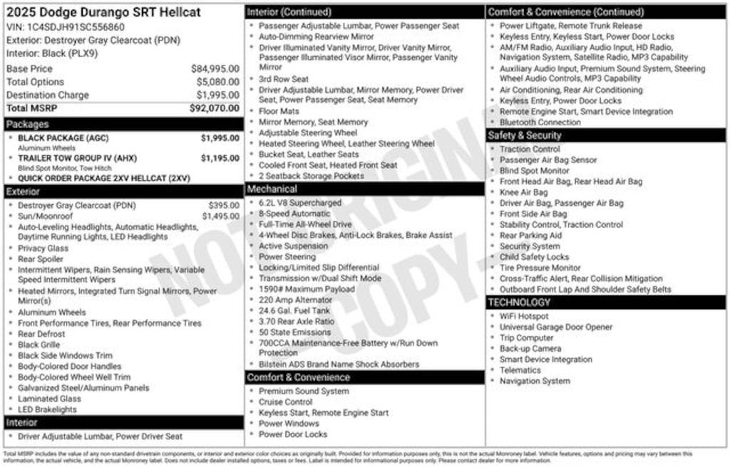 UNDER FACTORY WARRANTY, LOW MILES, Free Delivery within 100 miles!, AWD, 3rd row seats: split-bench, 7 & 4 Pin Wiring Harness, Apple CarPlay/Android Auto, Automatic temperature control, Black Package, Blind Spot w/Trailer Detection, Class IV Receiver Hitch, Eclipse Black Exhaust Tips, Gray Metallic Badges, Heated front seats, Heated rear seats, Leather Trimmed Bucket Seats, Navigation System, ParkView Rear Back-Up Camera, Power Liftgate, Power Sunroof, Quick Order Package 2XV Hellcat, Radio: Uconnect 5 Nav w/10.1" Display, Satin Black Dodge Tail Lamp Badge, Trailer Brake Control, Trailer Tow Group IV, Wheels: 20" x 10" Machine Face w/Dark Pockets, #6 Seat Foam Cushion, 3.70 Rear Axle Ratio, 4-Wheel Disc Brakes, 9 Speakers, ABS brakes, Adaptive suspension, Air Conditioning, Alloy wheels, AM/FM radio: SiriusXM w/360L, Audio memory, Auto-dimming door mirrors, Auto-dimming Rear-View mirror, Brake assist, Bumpers: body-color, Compass, Delay-off headlights, Driver door bin, Driver vanity mirror, Dual front impact airbags, Dual front side impact airbags, Electronic Stability Control, Emergency communication system: Dodge Connect, Four wheel independent suspension, Front anti-roll bar, Front Bucket Seats, Front Center Armrest w/Storage, Front dual zone A/C, Front reading lights, Fully automatic headlights, Garage door transmitter, Gloss Black Exterior Mirrors, Heated door mirrors, Heated steering wheel, Illuminated entry, Knee airbag, Leather Shift Knob, Leather steering wheel, Low tire pressure warning, Memory seat, Occupant sensing airbag, Outside temperature display, Overhead airbag, Overhead console, Panic alarm, Passenger door bin, Passenger vanity mirror, Power door mirrors, Power driver seat, Power passenger seat, Power steering, Power windows, Radio data system, Rain sensing wipers, Rear air conditioning, Rear anti-roll bar, Rear reading lights, Rear window defroster, Rear window wiper, Remote keyless entry, Security system, Speed control, Speed-sensing steering, Speed-Sensitive Wipers, Split folding rear seat, Spoiler, Sport steering wheel, Steering wheel mounted audio controls, Tachometer, Telescoping steering wheel, Tilt steering wheel, Traction control, Trip computer, Turn signal indicator mirrors, Variably intermittent wipers, Ventilated front seats, Voltmeter, AWD, 3rd row seats: split-bench, 7 & 4 Pin Wiring Harness, Apple CarPlay/Android Auto, Automatic temperature control, Black Package, Blind Spot w/Trailer Detection, Class IV Receiver Hitch, Eclipse Black Exhaust Tips, Gray Metallic Badges, Heated front seats, Heated rear seats, Leather Trimmed Bucket Seats, Navigation System, ParkView Rear Back-Up Camera, Power Liftgate, Power Sunroof, Quick Order Package 2XV Hellcat, Radio: Uconnect 5 Nav w/10.1" Display, Satin Black Dodge Tail Lamp Badge, Trailer Brake Control, Trailer Tow Group IV, Wheels: 20" x 10" Machine Face w/Dark Pockets. 2025 Dodge Durango SRT Hellcat