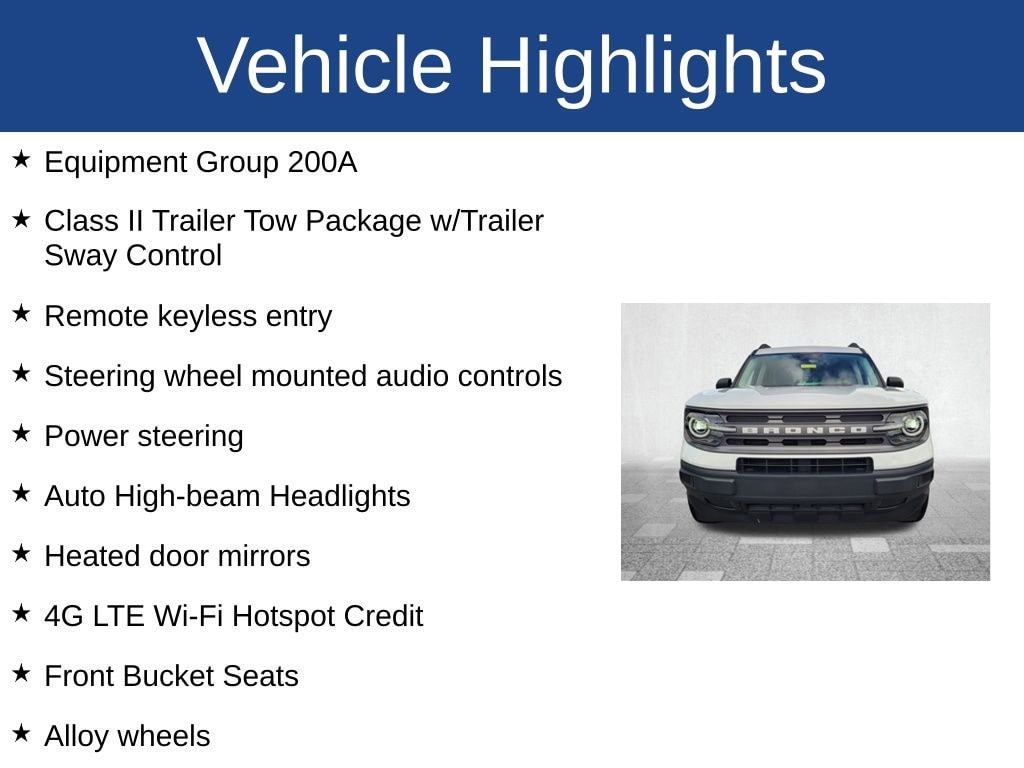 Bronco Sport Big Bend, 4D Sport Utility, 1.5L EcoBoost, 8-Speed Automatic, 4WD, Oxford White, Medium Dark Slate Cloth, 4G LTE Wi-Fi Hotspot Credit, Alloy wheels, Auto High-beam Headlights, Class II Trailer Tow Package w/Trailer Sway Control, Equipment Group 200A, Front Bucket Seats, Heated door mirrors, Power steering, Remote keyless entry, Steering wheel mounted audio controls.
