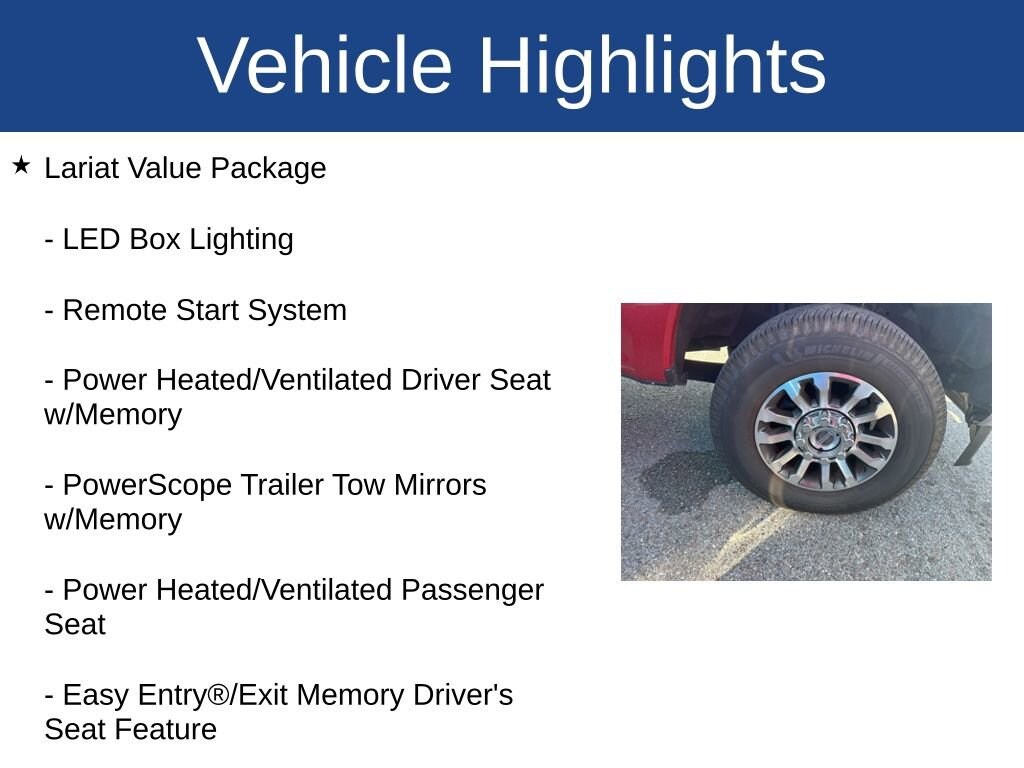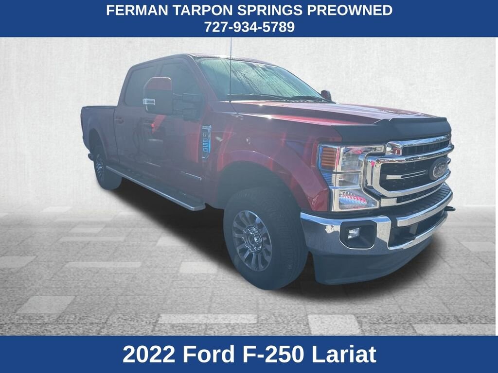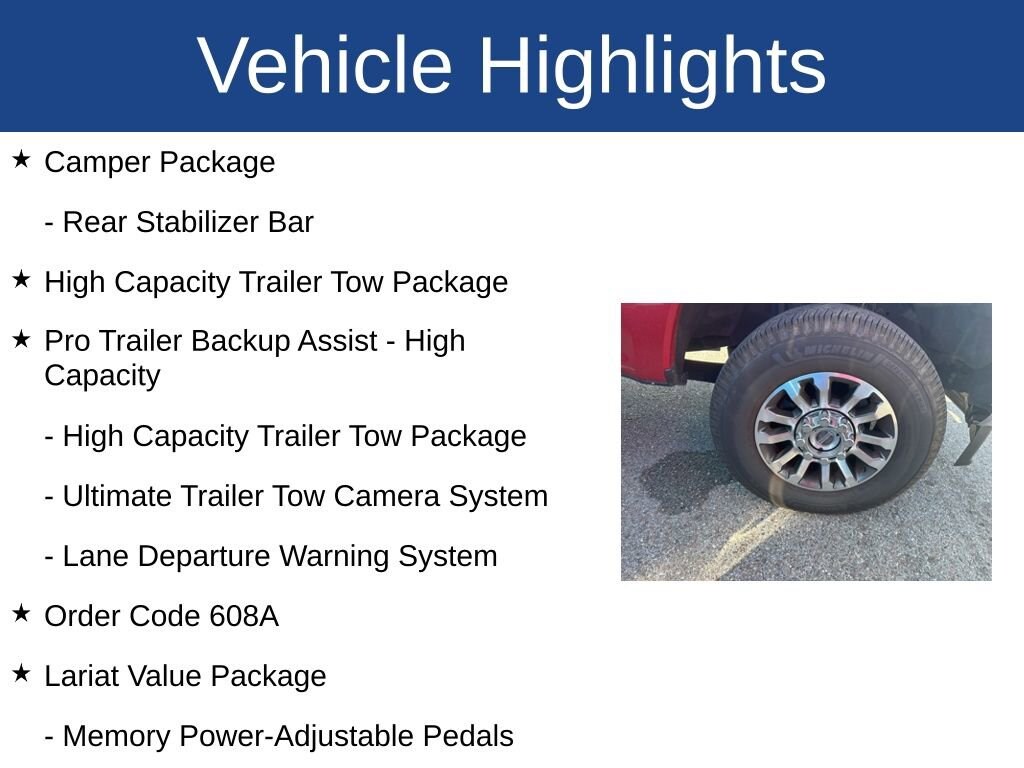 F-250 SuperDuty Lariat, 4D Crew Cab, Power Stroke 6.7L V8 DI 32V OHV Turbodiesel, 10-Speed Automatic, 4WD, Rapid Red Metallic Tinted Clearcoat, Baja Leather, Alloy wheels, Auto High-beam Headlights, Camper Package, Easy Entry®/Exit Memory Driver's Seat Feature, Front Bucket Seats, Front Center Armrest, GVWR: 10,000 lb Payload Package, Heated door mirrors, High Capacity Trailer Tow Package, Lane Departure Warning System, Lariat Value Package, LED Box Lighting, Memory Power-Adjustable Pedals, Navigation system: Connected Navigation, Order Code 608A, Power Heated/Ventilated Driver Seat w/Memory, Power Heated/Ventilated Passenger Seat, PowerScope Trailer Tow Mirrors w/Memory, Pro Trailer Backup Assist - High Capacity, Rear Stabilizer Bar, Remote Start System, Ultimate Trailer Tow Camera System.