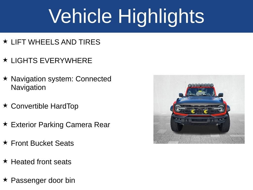 LIFT WHEELS AND TIRES, LIGHTS EVERYWHERE, Bronco Raptor, 4D Sport Utility, 3.0L EcoBoost V6, 10-Speed Automatic, 4WD, Orange, Vinyl, Convertible HardTop, Exterior Parking Camera Rear, Front Bucket Seats, Heated front seats, Navigation system: Connected Navigation, Passenger door bin.