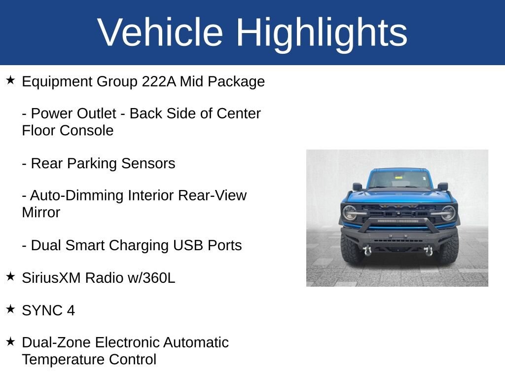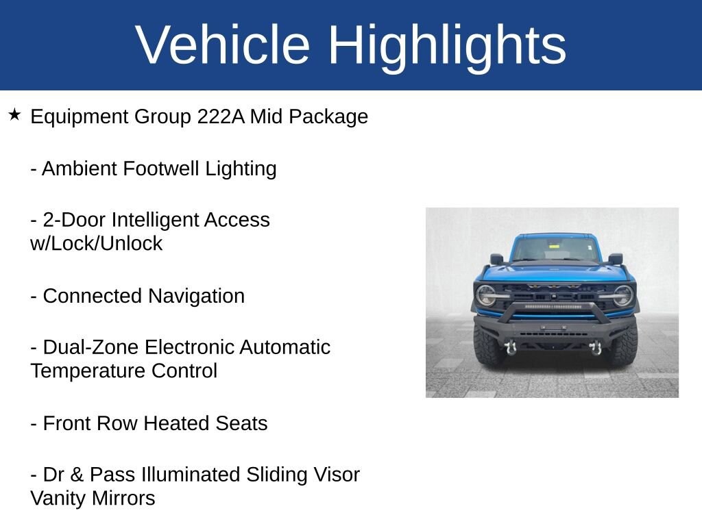 Bronco Big Bend, 4D Sport Utility, 2.3L EcoBoost I-4, 10-Speed Automatic, 4WD, Velocity Blue Metallic, Black Onyx Vinyl, 2-Door Intelligent Access w/Lock/Unlock, Ambient Footwell Lighting, Auto High-Beam Headlamps, Auto-Dimming Interior Rear-View Mirror, Connected Navigation, Dr & Pass Illuminated Sliding Visor Vanity Mirrors, Dual Smart Charging USB Ports, Dual-Zone Electronic Automatic Temperature Control, Equipment Group 222A Mid Package, Exterior Parking Camera Rear, Front Bucket Seats, Front Center Armrest, Front Row Heated Seats, Heated door mirrors, Power door mirrors, Power Outlet - Back Side of Center Floor Console, Rear Parking Sensors, SiriusXM Radio w/360L, SYNC 4.