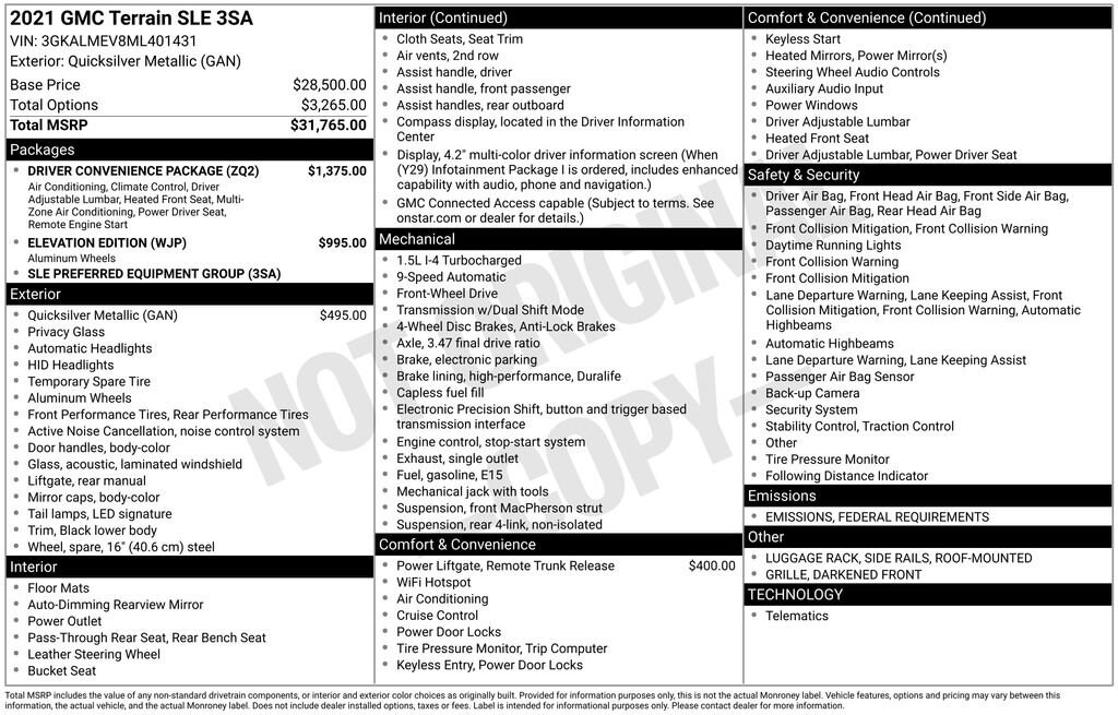 *BLUETOOTH*, *BACK UP CAMERA*, APPLE CarPlay/ANDROID AUTO, *USB, *ONE OWNER CLEAN CARFAX*, *FACTORY WARRANTY REMAINING*, Terrain SLE ELEVATION & DRIVER CONVENIENCE PKG, 2 USB Data Ports w/Auxiliary Input Jack, 6-Speaker Audio System Feature, 8-Way Power Driver Seat Adjuster, Air Conditioning, Apple CarPlay/Android Auto, Bluetooth® For Phone, Driver Convenience Package, Dual front impact airbags, Dual front side impact airbags, Dual-Zone Automatic Climate Control, Elevation Edition, Emergency communication system: OnStar and GMC connected services capable, Exterior Parking Camera Rear, Front Bucket Seats, Fully automatic headlights, High-Intensity Discharge Headlights, Occupant sensing airbag, Overhead airbag, Power Programmable Rear Liftgate, Radio: GMC Infotainment Audio System w/7 Display, Remote Start, Speed control, Steering wheel mounted audio controls, Wheels: 19 x 7.5 Gloss Black Painted Aluminum, 3.47 Axle Ratio, 4-Way Manual Driver's Seat, 4-Way Manual Front Passenger Seat, 4-Wheel Disc Brakes, 6 Speakers, ABS brakes, Alloy wheels, AM/FM radio, Auto High-beam Headlights, Auto-dimming Rear-View mirror, Black GMC Center Caps w/Black GMC Lettering, Black Mirror Caps, Brake assist, Bumpers: body-color, Compass, Darkened Front Grille, Delay-off headlights, Driver & Front Passenger Heated Seats, Driver door bin, Driver vanity mirror, Electronic Stability Control, Four wheel independent suspension, Front anti-roll bar, Front Center Armrest, Front reading lights, Heated door mirrors, Illuminated entry, Low tire pressure warning, Outside temperature display, Overhead console, Panic alarm, Passenger door bin, Passenger vanity mirror, Power door mirrors, Power Driver Lumbar Control, Power steering, Power windows, Preferred Equipment Group 3SA, Premium Cloth Seat Trim, Radio data system, Rear anti-roll bar, Rear seat center armrest, Rear window defroster, Rear window wiper, Remote keyless entry, Roof-Mounted Luggage Rack Black Side Rails, Security system, Speed-sensing steering, Split folding rear seat, Spoiler, Tachometer, Telescoping steering wheel, Tilt steering wheel, Traction control, Trip computer, Variably intermittent wipers, 39,582 MILES, AIR CONDITIONING, DUAL ZONE AUTOMATIC CLIMATE CONTROL, 19 GLOSS BLACK PAINTED ALUMINUM WHEELS, AUTOMATIC EMERGENCY BRAKING, FRONT PEDESTRIAN BRAKING, REAR VISION CAMERA, DRIVER CONVENIENCE PACKAGE: * SEAT, DRIVER 8-WAY POWER WITH 2-WAY POWER LUMBAR * DRIVER & FRONT PASSENGER HEATED SEATS * REMOTE VEHICLE START * AIR CONDITIONING, DUAL ZONE AUTOMATIC CLIMATE CONTROL, ELEVATION EDITION: * WHEELS, 19 GLOSS BLACK PAINTED ALUMINUM * DARKENED FRONT GRILLE * BLACK ROOF SIDE RAILS * BLACK CENTER CAPS, MIRROR CAPS, EXTERIOR ACCENTS & TRIM BADGING, LANE KEEP ASSIST W/ LANE DEPARTURE WARNING, FORWARD COLLISION ALERT, QUICKSILVER METALLIC, REMOTE VEHICLE START, Terrain SLE ELEVATION & DRIVER CONVENIENCE PKG, 2 USB Data Ports w/Auxiliary Input Jack, 6-Speaker Audio System Feature, 8-Way Power Driver Seat Adjuster, Air Conditioning, Apple CarPlay/Android Auto, Bluetooth® For Phone, Driver Convenience Package, Dual front impact airbags, Dual front side impact airbags, Dual-Zone Automatic Climate Control, Elevation Edition, Emergency communication system: OnStar and GMC connected services capable, Exterior Parking Camera Rear, Front Bucket Seats, Fully automatic headlights, High-Intensity Discharge Headlights, Occupant sensing airbag, Overhead airbag, Power Programmable Rear Liftgate, Radio: GMC Infotainment Audio System w/7 Display, Remote Start, Speed control, Steering wheel mounted audio controls, Wheels: 19 x 7.5 Gloss Black Painted Aluminum.