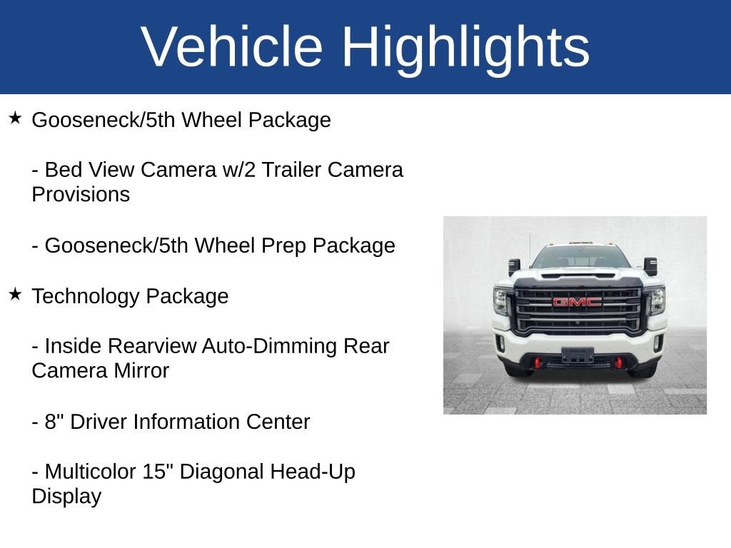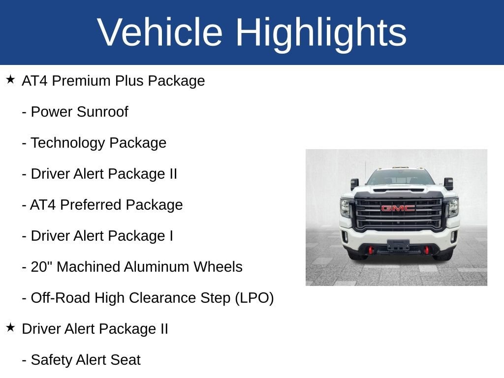 Sierra 2500HD AAT4, 4D Crew Cab, Duramax 6.6L V8 Turbodiesel, 10-Speed Automatic, 4WD, Summit White, Jet Black With Kalahari Accents Leather, 10-Way Power Passenger Seat Adjuster w/Lumbar, 2 USB Ports, 20 Machined Aluminum Wheels, 8 Driver Information Center, AT4 Preferred Package, AT4 Premium Plus Package, Auto-dimming door mirrors, Automatic Emergency Braking, Bed View Camera w/2 Trailer Camera Provisions, Bose Premium 7 Speaker Sound System, Delay-off headlights, Driver Alert Package I, Driver Alert Package II, Driver Memory, Following Distance Indicator, Forward Collision Alert, Front Bucket Seats, Front Center Armrest, Gooseneck/5th Wheel Package, Gooseneck/5th Wheel Prep Package, HD Surround Vision w/2 Trailer View Camera Provisions, Heated & Ventilated Front Bucket Seats, Heated 2nd Row Outboard Seats, Heated Driver & Front Outboard Passenger Seats, Heated front seats, Heated rear seats, Hill Descent Control, Inside Rearview Auto-Dimming Rear Camera Mirror, IntelliBeam Automatic High Beam On/Off, Lane Change Alert w/Side Blind Zone Alert, Lane Departure Warning System, LED Smoked Amber Roof Marker Lamps, Multicolor 15 Diagonal Head-Up Display, Off-Road High Clearance Step (LPO), Perimeter Lighting, Pickup Box, Power Sliding Rear Window w/Defogger, Power steering, Power Sunroof, Power windows, Power Windows w/Driver Express Up/Down, Radio: AM/FM w/Prem GMC Infotainment System & Navi, Rear Cross Traffic Alert, Remote keyless entry, Safety Alert Seat, Technology Package, Ultrasonic Front & Rear Park Assist, Universal Home Remote, Wireless Charging, X31 Off-Road Package.