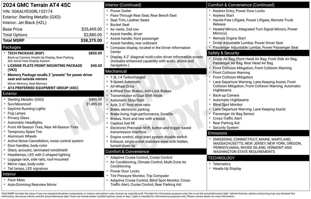*ONE OWNER*, *CLEAN CARFAX*, *BACK UP CAMERA*, *USB/HANDS FREE/GPS BLUETOOTH*, Terrain AT4, 4D Sport Utility, 1.5L DOHC, 9-Speed Automatic, AWD, Sterling Metallic, Jet Black Leather, 2 USB Data Ports, 2 USB Data Ports w/SD Card Reader, 3.47 Final Drive Axle Ratio, 4-Wheel Disc Brakes, 6 Speakers, 6-Speaker Audio System Feature, 6-Way Power Front Passenger Seat, 8-Way Power Driver Seat Adjuster, ABS brakes, Air Conditioning, Alloy wheels, AM/FM radio: SiriusXM, Auto High-beam Headlights, Auto-dimming Rear-View mirror, Automatic temperature control, Bluetooth® For Phone, Brake assist, Bumpers: body-color, Compass, Delay-off headlights, Driver & Front Passenger Heated Seats, Driver door bin, Driver vanity mirror, Dual front impact airbags, Dual front side impact airbags, Electronic Stability Control, Emergency communication system: OnStar and GMC connected services capable, Four wheel independent suspension, Front & Rear Park Assist, Front anti-roll bar, Front Bucket Seats, Front Center Armrest, Front dual zone A/C, Front fog lights, Front Passenger 2-Way Power Lumbar, Front reading lights, Fully automatic headlights, Garage door transmitter, HD Surround Vision, Head-Up Display, Heated door mirrors, Heated front seats, Heated steering wheel, Illuminated entry, License Plate Front Mounting Package, Low tire pressure warning, Memory seat, Navigation system: GMC Connected Navigation, Occupant sensing airbag, Outside temperature display, Overhead airbag, Overhead console, Panic alarm, Passenger door bin, Passenger vanity mirror, Perforated Leather-Appointed Seat Trim w/AT4 Logo, Power door mirrors, Power Driver Lumbar Control, Power driver seat, Power Liftgate, Power passenger seat, Power steering, Power windows, Preferred Equipment Group 4SC, Radio data system, Radio: GMC Infotainment Audio System w/8" Display, Rear anti-roll bar, Rear seat center armrest, Rear window defroster, Rear window wiper, Remote keyless entry, Roof rack: rails only, Security system, SiriusXM, Skyscape Power Sunroof w/Power Sunscreen, Speed control, Speed-sensing steering, Split folding rear seat, Spoiler, Steering wheel mounted audio controls, Tachometer, Tech Package, Telescoping steering wheel, Tilt steering wheel, Traction control, Trip computer, Turn signal indicator mirrors, Variably intermittent wipers, Wheels: 17" x 7" Gloss Black Aluminum, Wireless Apple CarPlay/Wireless Android Auto, AWD, Terrain AT4, 4D Sport Utility, 1.5L DOHC, 9-Speed Automatic, AWD, Sterling Metallic, Jet Black Leather.