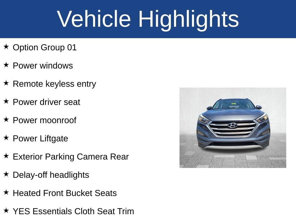 Tucson Value, 4D Sport Utility, 1.6L I4 DGI Turbocharged DOHC 16V ULEV II 175hp, 7-Speed Automatic, FWD, Coliseum Gray, Gray Cloth, Alloy wheels, Delay-off headlights, Exterior Parking Camera Rear, Front Bucket Seats, Front Center Armrest, Heated Front Bucket Seats, Heated front seats, Option Group 01, Power driver seat, Power Liftgate, Power moonroof, Power windows, Remote keyless entry, Split folding rear seat, YES Essentials Cloth Seat Trim.