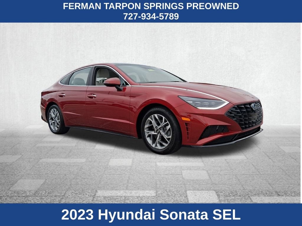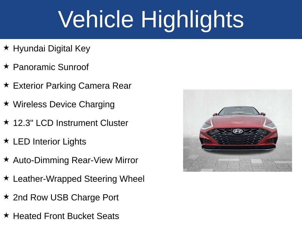 Sonata SEL, 4D Sedan, 2.5L I4, 8-Speed Automatic with SHIFTRONIC, FWD, Ultimate Red, Dark Gray Cloth, 12.3 LCD Instrument Cluster, 2nd Row Air Vent, 2nd Row USB Charge Port, Alloy wheels, Auto-Dimming Rear-View Mirror, Convenience Package, Exterior Parking Camera Rear, Front Bucket Seats, Heated Front Bucket Seats, Heated front seats, Hyundai Digital Key, Leather-Wrapped Steering Wheel, LED Interior Lights, Navigation System, Option Group 02, Panoramic Sunroof, Power driver seat, Power steering, Power windows, Premium Cloth Seating Surfaces, Remote keyless entry, Steering wheel mounted audio controls, Wireless Device Charging.