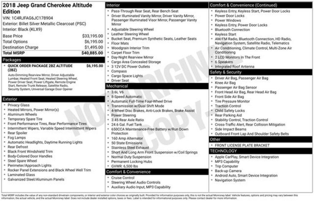 Free Delivery within 100 miles!, 4WD, 1-Year SiriusXM Guardian Trial, 1-Year SiriusXM Radio Service, 115V Auxiliary Power Outlet, 3.45 Rear Axle Ratio, 4-Wheel Disc Brakes, 5-Year SiriusXM Traffic Service, 5-Year SiriusXM Travel Link Service, 6 Speakers, 8.4" Touchscreen Display, ABS brakes, Air Conditioning, Alloy wheels, Altitude Grille, Altitude IV Package, AM/FM radio, Anti-whiplash front head restraints, Apple CarPlay, Apple CarPlay/Android Auto, Auto-Dimming Rear-View Mirror, Automatic temperature control, Black Suede Seats w/Black Stitching, Body Color Claddings, Body Color Fascia, Body Color Shark Fin Antenna, Brake assist, Bumpers: body-color, Cargo Compartment Cover, Cloth Bucket Seats, Compass, Dark Day Light Opening Moldings, Dark Headlamp Bezel Finish, Dark Lens Taillamps, Delay-off headlights, Delete Laredo Badge, Driver door bin, Driver vanity mirror, Dual front impact airbags, Dual front side impact airbags, Electronic Stability Control, For Details Visit DriveUconnect.com, Four wheel independent suspension, Front Accent/Body Color Fascia, Front anti-roll bar, Front Bucket Seats, Front Center Armrest w/Storage, Front dual zone A/C, Front fog lights, Front License Plate Bracket, Front reading lights, Fully automatic headlights, Gloss Black Rear Fascia Applique, Google Android Auto, GPS Antenna Input, GPS Navigation, HD Radio, Heated door mirrors, Illuminated entry, Integrated Voice Command w/Bluetooth, Jeep Black Gloss Badging, Knee airbag, Leather Shift Knob, Low tire pressure warning, Normal Duty Suspension, Occupant sensing airbag, Outside temperature display, Overhead airbag, Overhead console, Panic alarm, ParkView Rear Back-Up Camera, Passenger door bin, Passenger vanity mirror, Power 4-Way Driver Lumbar Adjust, Power 8-Way Driver/Manual Passenger Seat, Power door mirrors, Power Liftgate, Power steering, Power windows, Quick Order Package 2BZ Altitude, Radio data system, Radio: Uconnect 4 w/7" Display, Radio: Uconnect 4C Nav w/8.4" Display, Rear Accent/Body Color Fascia, Rear anti-roll bar, Rear Fascia Black MIC Step Pad, Rear reading lights, Rear seat center armrest, Rear window defroster, Rear window wiper, Remote keyless entry, Security & Convenience Group, Security Alarm, Single Exhaust w/Bright Tip, SiriusXM Satellite Radio, SiriusXM Traffic Plus, SiriusXM Travel Link, Speed control, Speed-Sensitive Wipers, Split folding rear seat, Spoiler, Steering Wheel Mounted Audio Controls, Steering wheel mounted audio controls, Tachometer, Telescoping steering wheel, Tilt steering wheel, Traction control, Trip computer, Universal Garage Door Opener, USB Host Flip, Variably intermittent wipers, Wheels: 17" x 8.0" Silver Aluminum, Wheels: 20" x 8.0" Gloss Black Aluminum, 4WD. 2018 Jeep Grand Cherokee Altitude