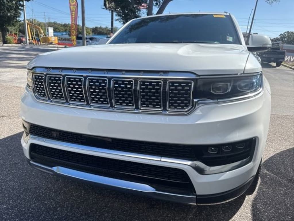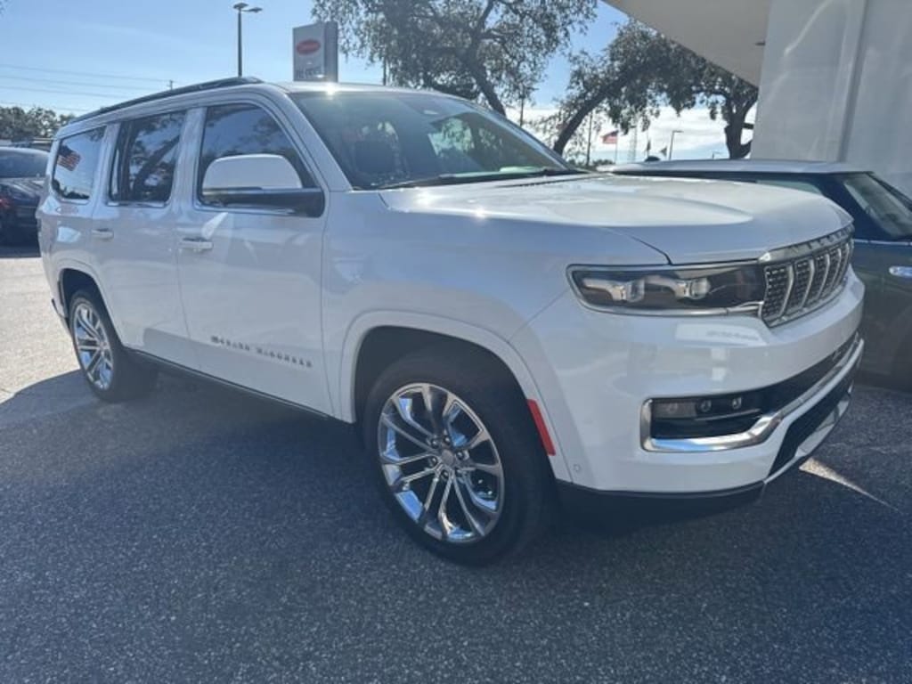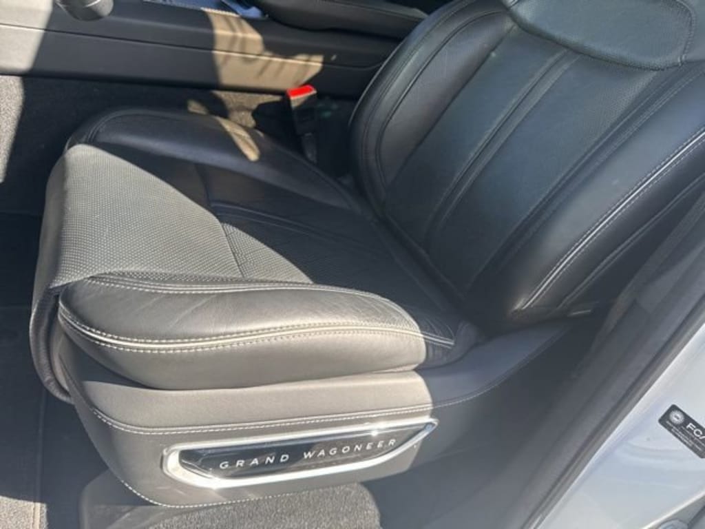 LOCAL TRADE, The 2022 Grand Wagoneer Series II delivers a full-size luxury SUV experience from Jeep, combining potent performance, premium finishes, and three-row practicality in a commanding package. Performance & Powertrain Under the hood sits a 6.4-liter HEMI V8 engine producing 471 hp and 455 lb-ft of torque. Edmunds +2 Kbb.com +2 This powertrain is paired with an 8-speed automatic transmission and standard full-time four-wheel drive. Kbb.com +1 For those seeking an upgrade, a twin-turbo 3.0-liter Hurricane straight-six producing up to 510-hp is available, though the 6.4 V8 is the baseline in Series II. Car and Driver +1 The Series II model is built on a robust platform: it measures 214.7 inches in length with a 123-inch wheelbase, highlighting its full-size SUV proportions. Edmunds +1 In towing capability, it doesn't disappoint capable of pulling up to roughly 9,850 lbs when properly equipped. Edmunds +1 Fuel economy reflects the performance nature: expect approximately 13 mpg city / 18 mpg highway in typical configurations. Car and Driver +1 Design & Exterior The Grand Wagoneer Series II projects an imposing presence, with bold styling cues including a two-tone roof option, premium 22-inch polished aluminum wheels (standard on Series II), and upscale exterior badging. hughwhitechryslerdodgejeepram.com +1 Its height and width reflect its status as a top-end three-row SUV: overall width without mirrors sits about 83.6 inches and height about 75.6 inches. Cars.com +1 The body features refined touches such as LED lighting, power-deployable running boards, and optional tri-pane panoramic sunroof to enhance both presence and utility. Interior & Features Inside, the Series II delineates itself with premium Palermo leather-trimmed seating including massaging front seats with memory, a digital rear-view mirror, and upgraded amenities not found on the base trim. hughwhitechryslerdodgejeepram.com Standard in all Grand Wagoneer models are luxurious finishes, rich wood and metal accents, a 12.0 inch center touchscreen (Uconnect 5), a 12.3 inch digital gauge cluster, and multiple screens for second- and third-row occupants. Car and Driver Seating is configured for seven (captains chairs in row two) or eight passengers with bench seating, giving families and luxury-oriented buyers serious flexibility. With all seats in place, cargo space behind the third row is around 27 cu ft, and expands significantly when the third row is folded. Edmunds +1 Driver-aid technology is robust: series features include surround-view camera, adaptive cruise control, automated parking, night-vision pedestrian/animal detection (optional), and full suite of driver-assist systems. Car and Driver Practicality & Utility As a three-row, full-size luxury SUV, the Grand Wagoneer Series II offers strong utility. With its size comes true adult-friendly space in rows two and three and generous cargo room when the rearmost seats are folded. Reviewers note its commanding on-road presence and smooth ride, owing in part to independent rear suspension and optional air suspension. Car and Driver +1 While its massive weighing over 6,300 lbs in many configurations it balances heavy luxury with serious capability including its high towing rating mentioned earlier., 23 Speaker McIntosh Reference Audio System, 2nd Row Dual Charge-Only USB Ports, 40/20/40 Power Recline Tip/Slide, 8-Passenger Seating, Adjustable Roof Rail Crossbars, Cargo Cover, Flexible Seating Group, Front Console Cooler, Premium Group II, Premium Tinted Glass, Quick Order Package 23S, Two Tone Paint Group, Ventilated Rear Seats.