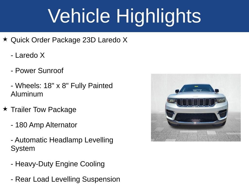 Grand Cherokee Laredo, 4D Sport Utility, 3.6L V6 24V VVT, 8-Speed Automatic, 4WD, Silver Zynith, Black Cloth, 115V Auxiliary Power Outlet, 180 Amp Alternator, 7 & 4-Pin Wiring Harness, Alloy wheels, Automatic Headlamp Levelling System, Class IV Receiver Hitch, Four wheel independent suspension, Heated Front Seats, Heated Steering Wheel, Heavy-Duty Engine Cooling, Laredo X, Luxury Tech Group I, Power Liftgate, Power Sunroof, Quick Order Package 23D Laredo X, Rain Sensitive Windshield Wipers, Rear Load Levelling Suspension, Remote Start System, Secondary Active Grille Shutters, Selectable Tire Fill Alert, Trailer Hitch Zoom, Trailer Tow Package, Wireless Charging Pad.