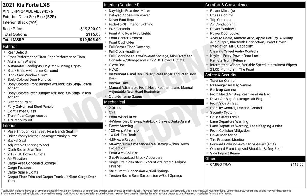 *BLUETOOTH*, *BACK UP CAMERA*, *ALLOY WHEELS*, *ONE OWNER*, APPLE CarPlay/ANDROID AUTO, *USB, Forte LXS, Air Conditioning, Apple CarPlay & Android Auto, Dual front impact airbags, Dual front side impact airbags, Exterior Parking Camera Rear, Front Bucket Seats, Fully automatic headlights, Lane Departure Warning System, Occupant sensing airbag, Overhead airbag, Radio: AM/FM/MP3 Display Audio System, Speed control, Steering wheel mounted audio controls, Wheels: 16 Machine Finish Alloy, 4 Speakers, 4-Wheel Disc Brakes, ABS brakes, Alloy wheels, AM/FM radio, Brake assist, Bumpers: body-color, Cargo Tray, Delay-off headlights, Driver door bin, Driver vanity mirror, Electronic Stability Control, Front anti-roll bar, Front Center Armrest, Front reading lights, Front wheel independent suspension, Illuminated entry, Low tire pressure warning, Outside temperature display, Overhead console, Panic alarm, Passenger door bin, Passenger vanity mirror, Power door mirrors, Power steering, Power windows, Radio data system, Rear reading lights, Rear window defroster, Remote keyless entry, Security system, Split folding rear seat, Tachometer, Telescoping steering wheel, Tilt steering wheel, Traction control, Trip computer, Variably intermittent wipers, Woven Cloth Seat Trim, NEW CHEVROLET TRADE, Forward Collision Warning, Forward Collision-Avoidance Assist-Car, Lane Departure Warning, Lane Keeping Assist-Line, Rear View Camera with Dynamic Guidelines, Forte LXS, Air Conditioning, Apple CarPlay & Android Auto, Dual front impact airbags, Dual front side impact airbags, Exterior Parking Camera Rear, Front Bucket Seats, Fully automatic headlights, Lane Departure Warning System, Occupant sensing airbag, Overhead airbag, Radio: AM/FM/MP3 Display Audio System, Speed control, Steering wheel mounted audio controls, Wheels: 16 Machine Finish Alloy.